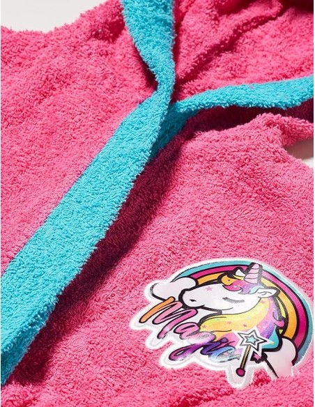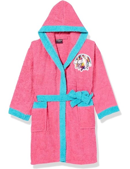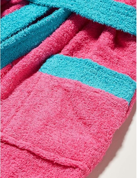 Albornoz infantil con capucha en color rosa y cinturón, bolsillos y puños en azul.