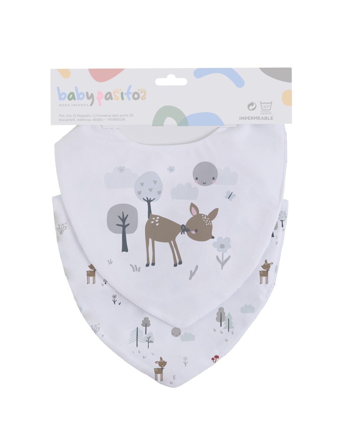 Babero blanco con dibujo de ciervo en el campo y babero blanco con estampado.