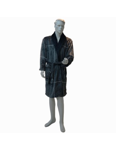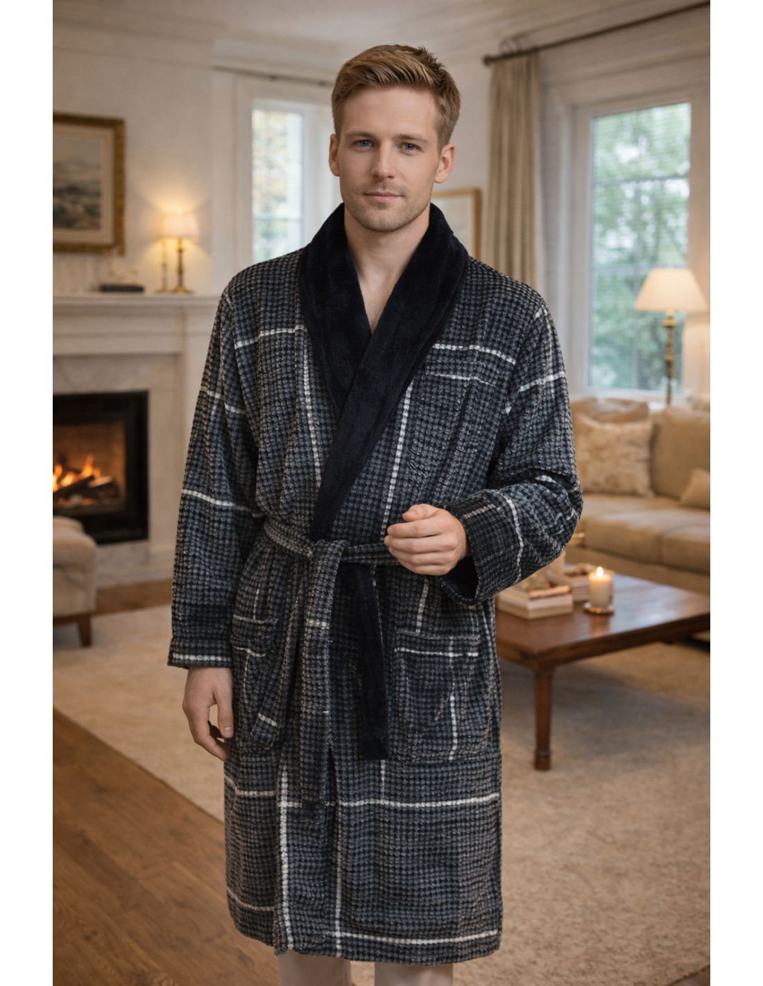 Bata larga de hombre de nuestra marca exclusiva Carwin. De color gris oscuro a cuadros con líneas blancas discontinuas.
