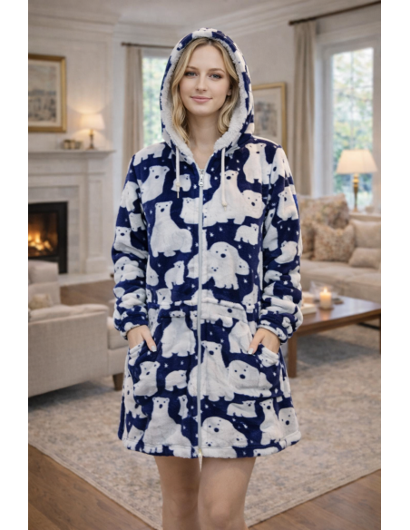 Bata corta de mujer de color marino con estampado de osos polares. Con bolsillos exteriores grandes. Cierre con cremallera y capucha con borreguillo.