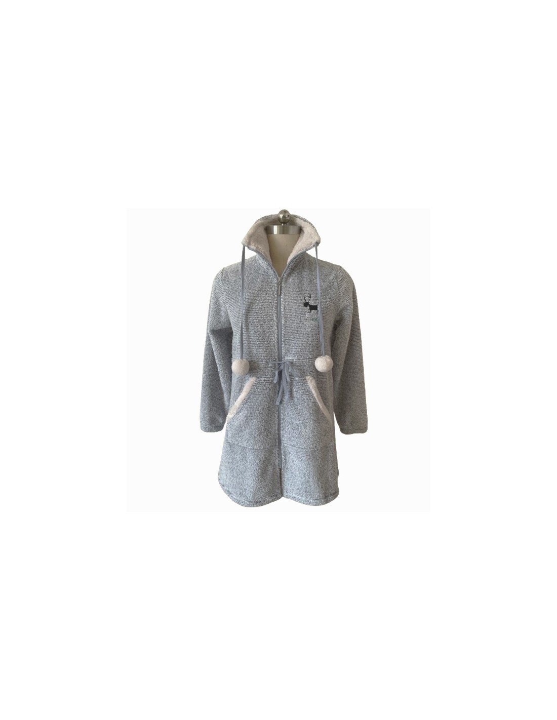 Bata corta de mujer de color grisáceo con textura rayada y bordado de reno en el pecho. Con bolsillos exteriores grandes. Cierre con cremallera y pom poms en las gomas del cuello.
