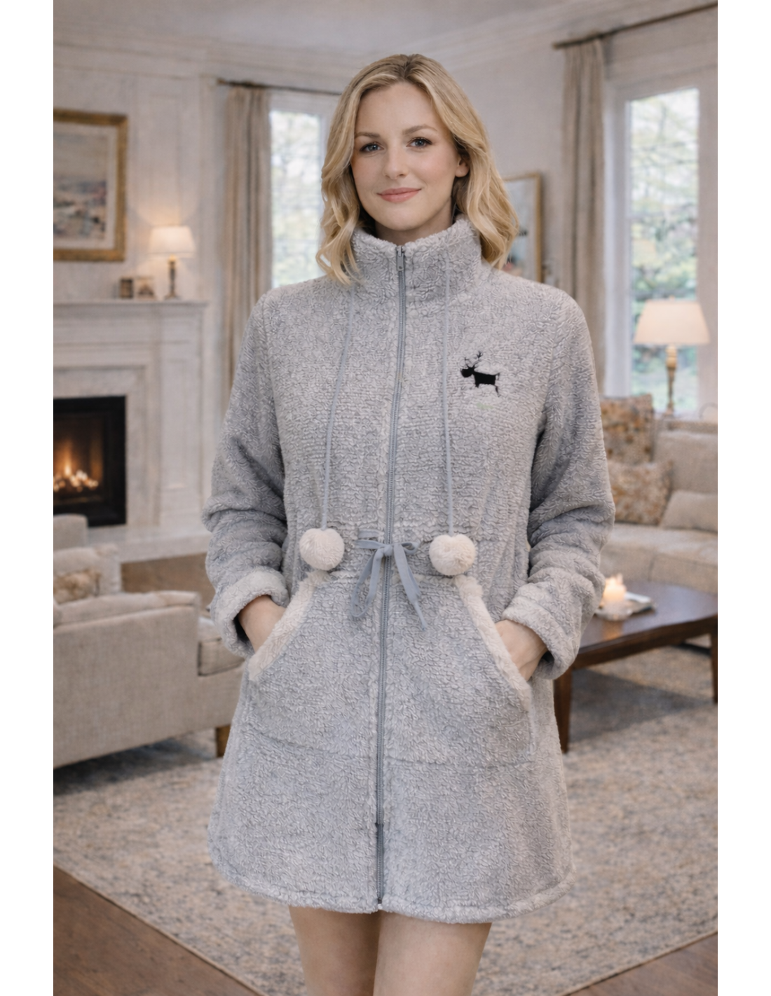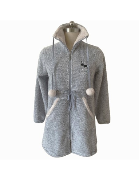 Bata corta de mujer de color grisáceo con textura rayada y bordado de reno en el pecho. Con bolsillos exteriores grandes. Cierre con cremallera y pom poms en las gomas del cuello.