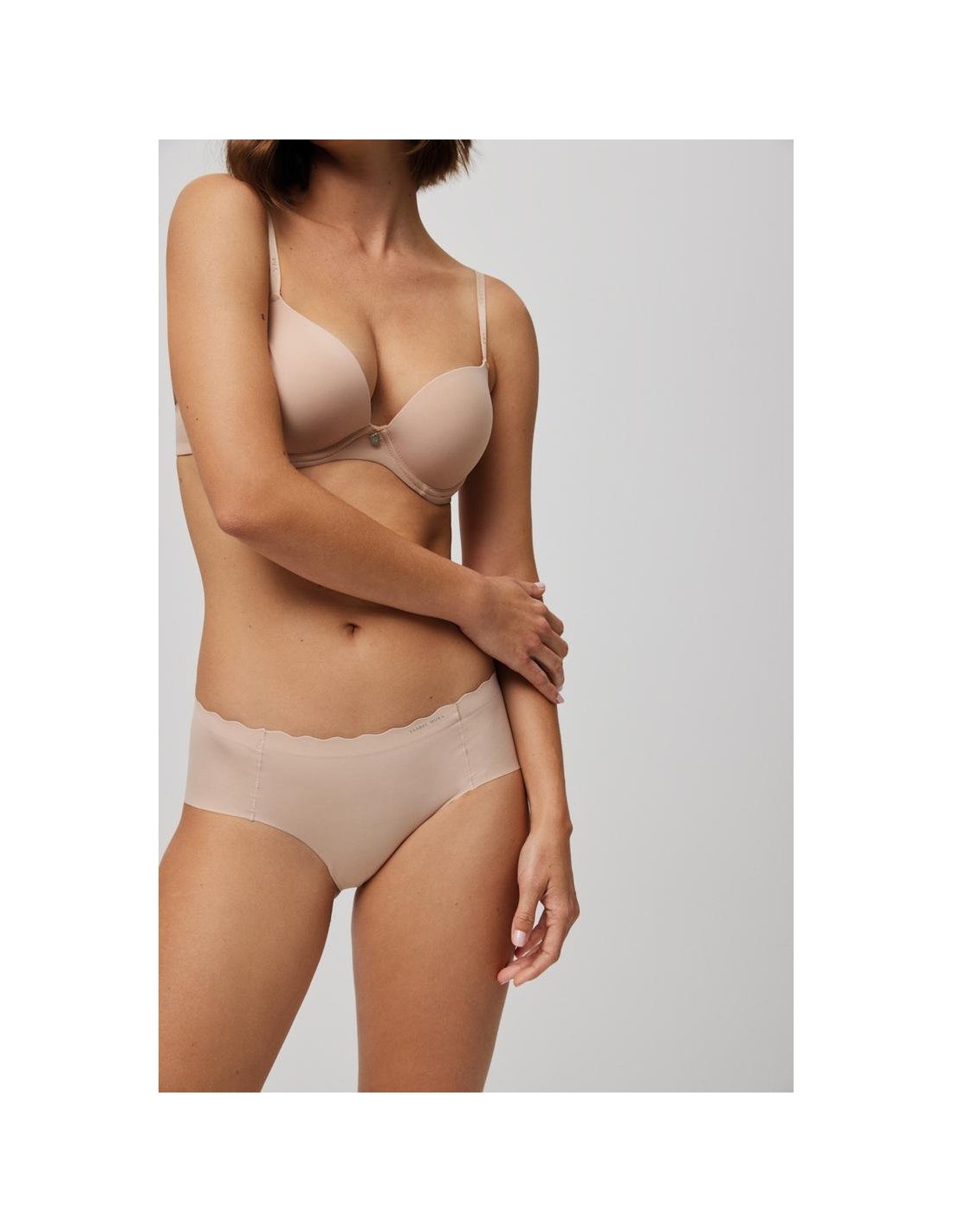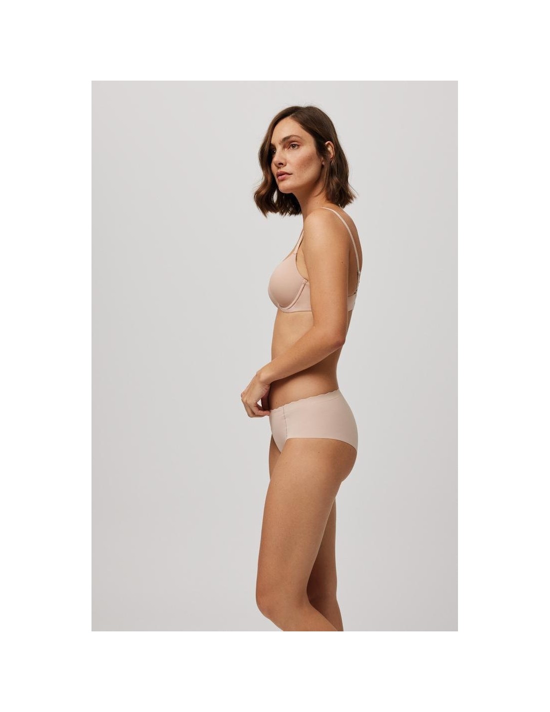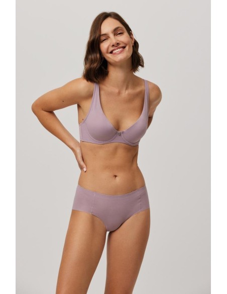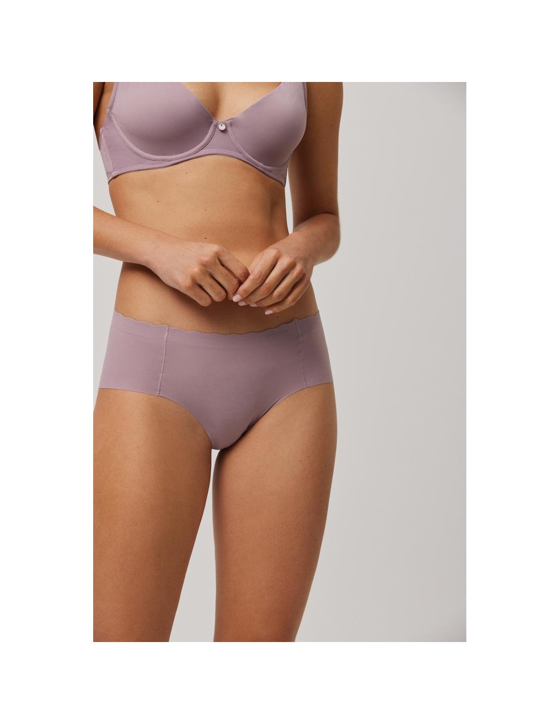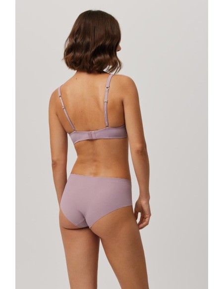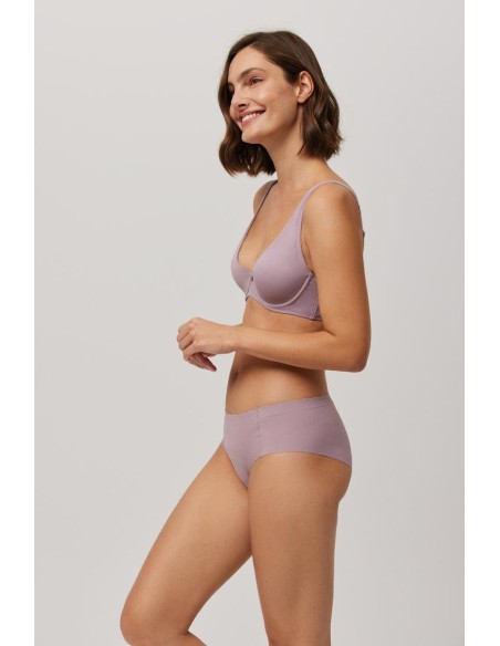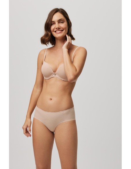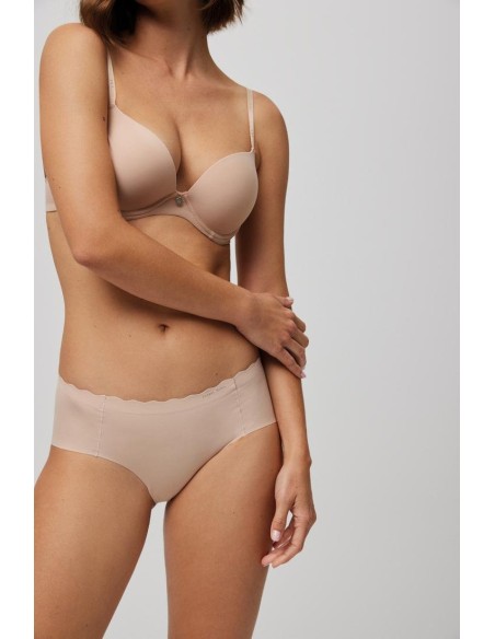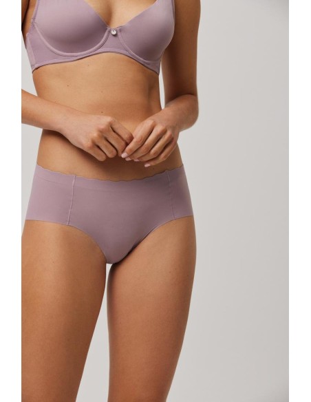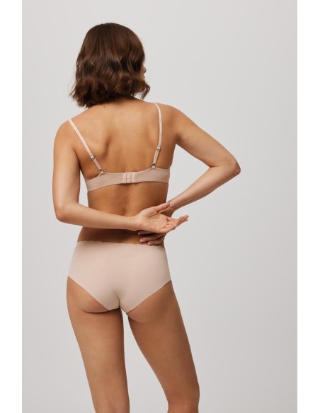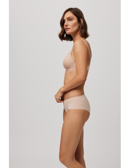 Braga midi de tejido de microfibra cortada a láser con cinturilla ondulada y con costuras muy discretas que hacen que la prenda sea imperceptible bajo la ropa.