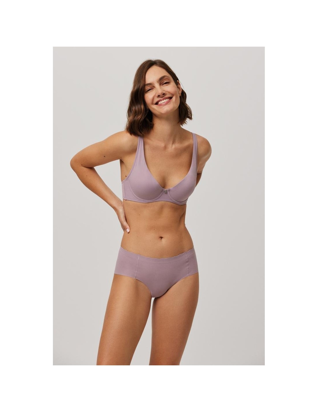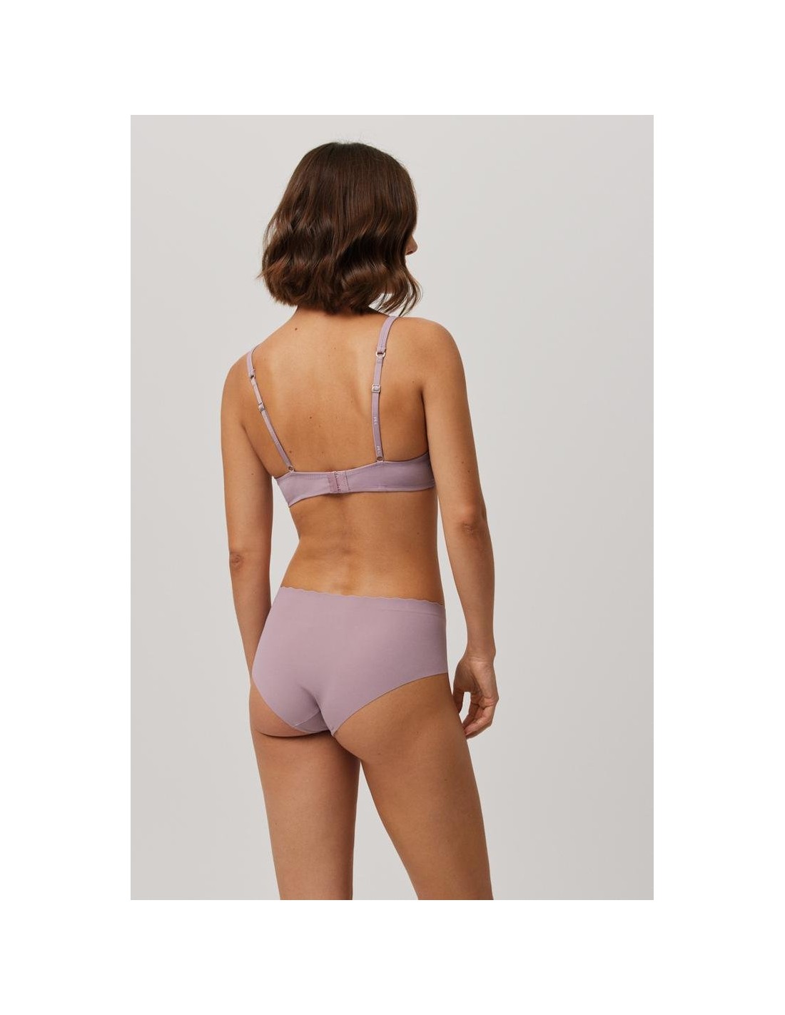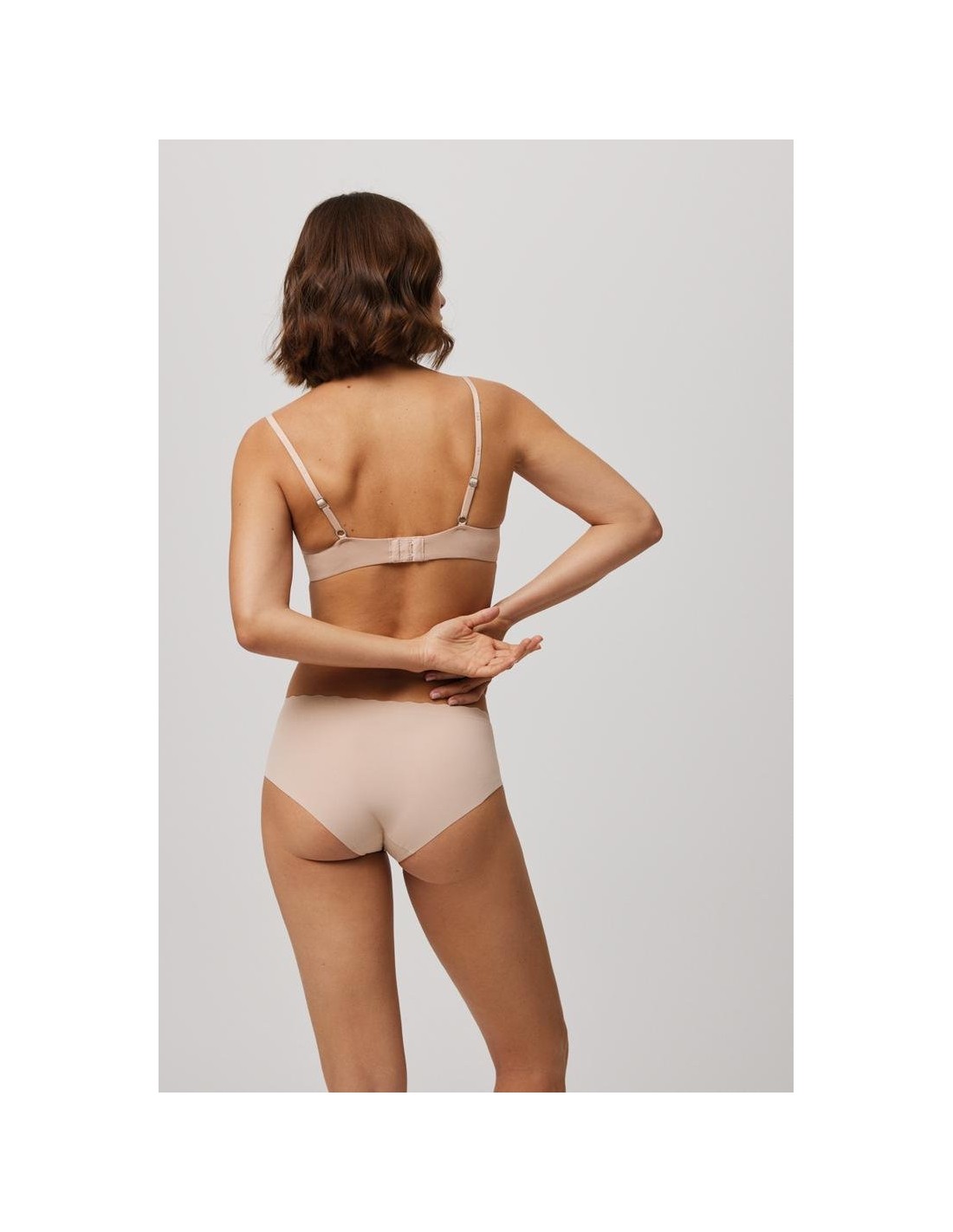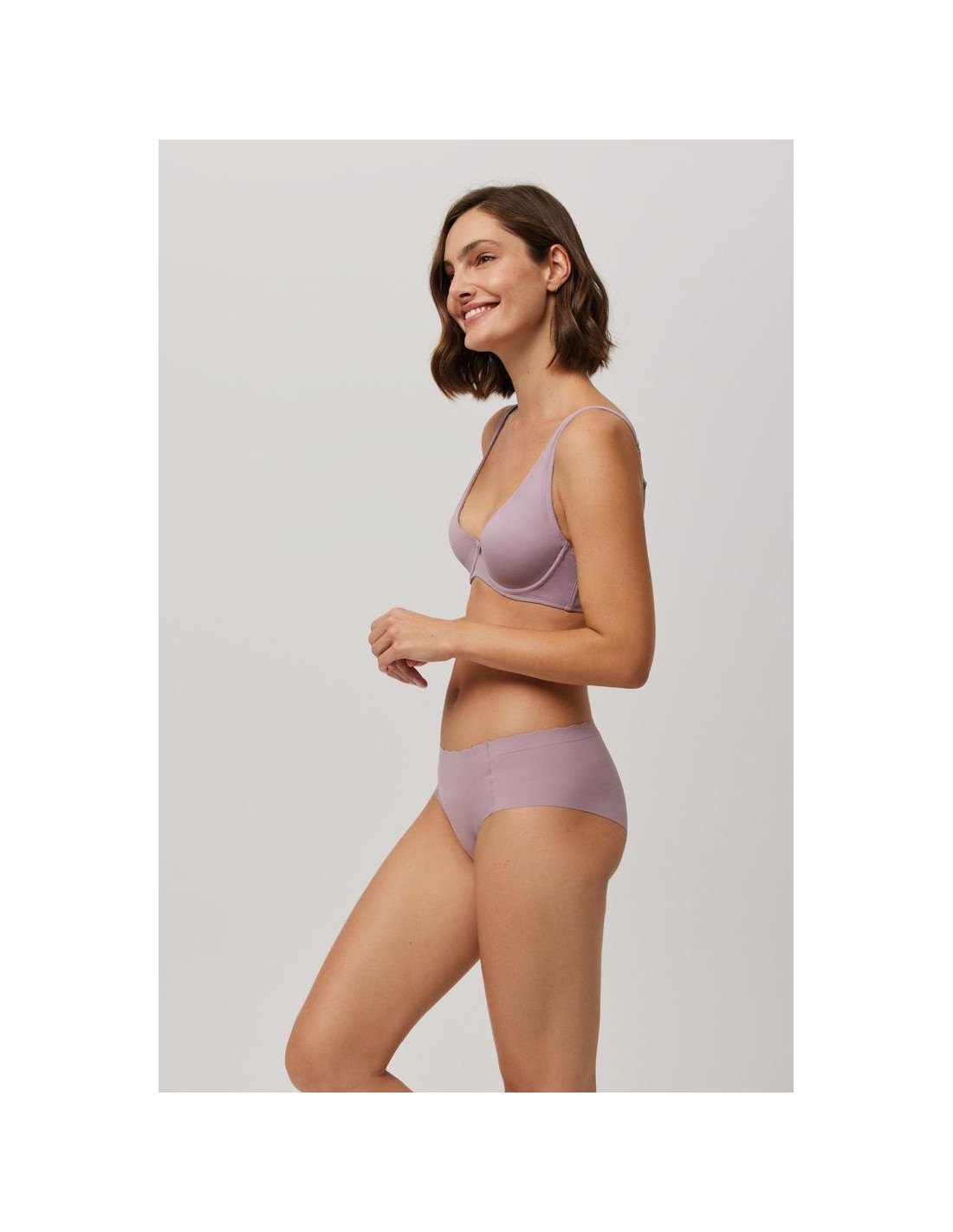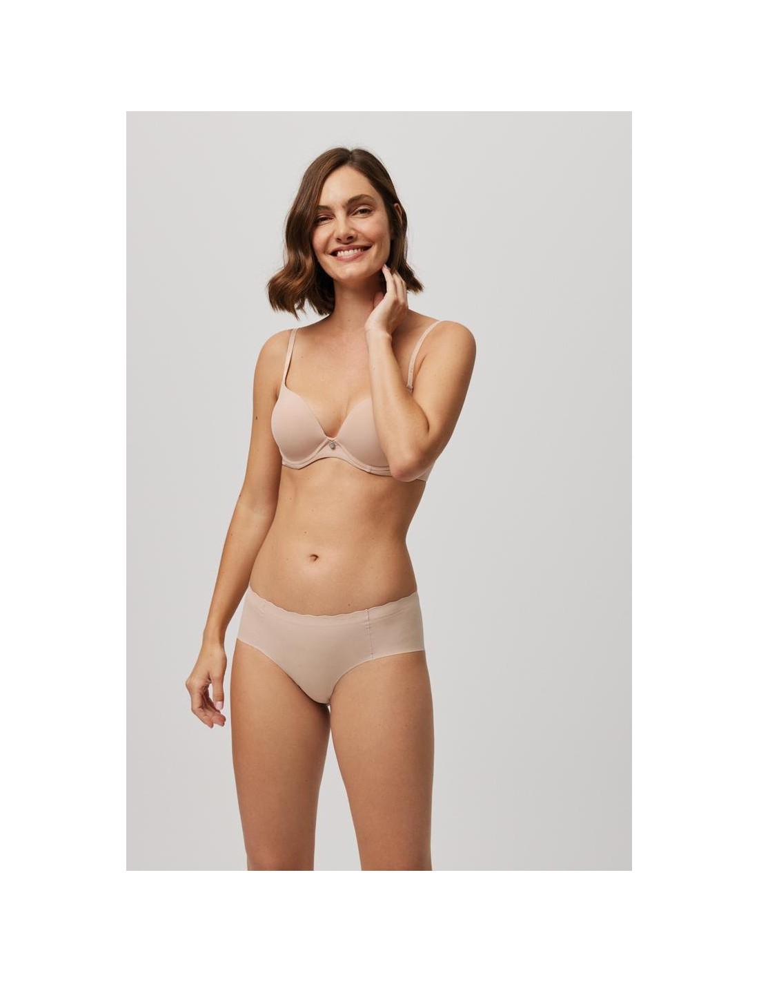 Braga midi de tejido de microfibra cortada a láser con cinturilla ondulada y con costuras muy discretas que hacen que la prenda sea imperceptible bajo la ropa.