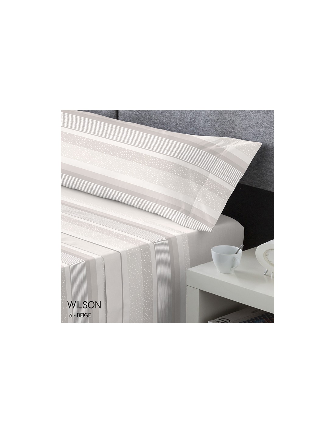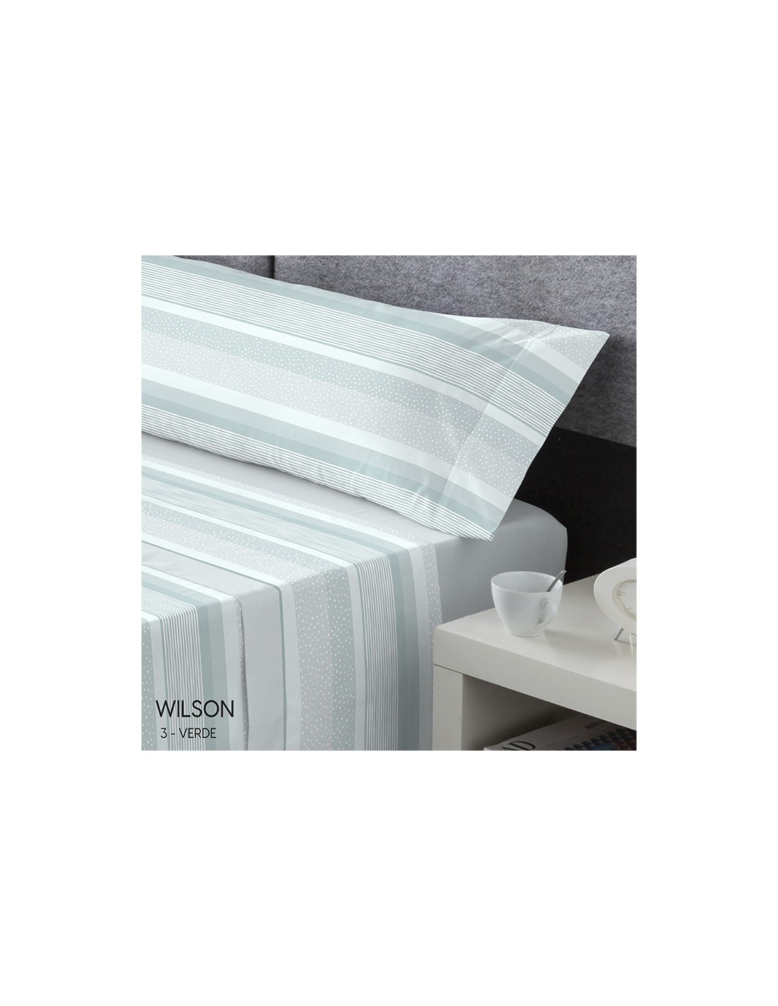 Bajera lisa de color y sábana encimera y funda de almohada a franjas con líneas y puntos.