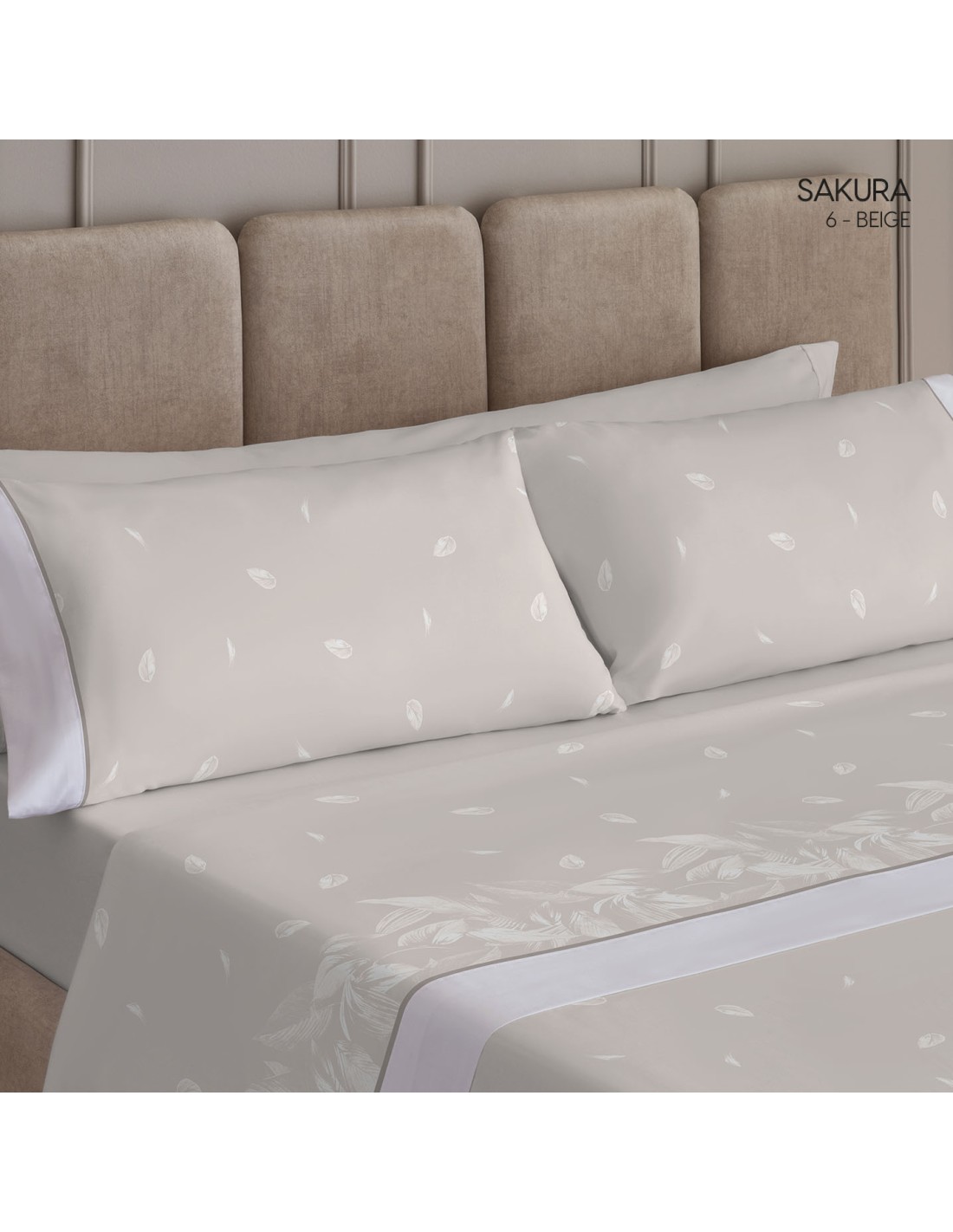 Sábana bajera lisa de color beige y sábana encimera y funda de almohada con estampado de hojas.