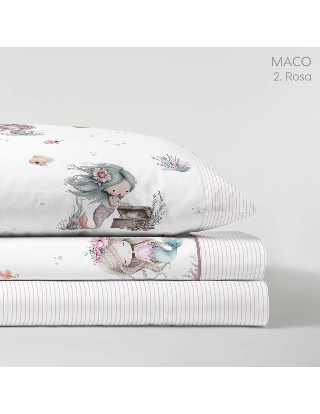 Sábana bajera a rayas y sábana encimera y funda de almohada con estampado de sirenas.