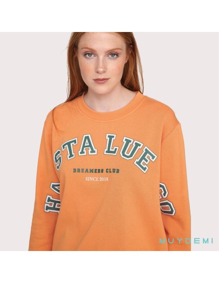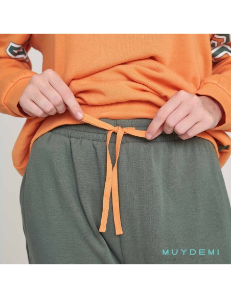 Pijama largo de mujer para invierno compuesto por sudadera de color naranja con frase Hasta luego dreamers club y pantalón liso de color verde con bolsillos laterales.
