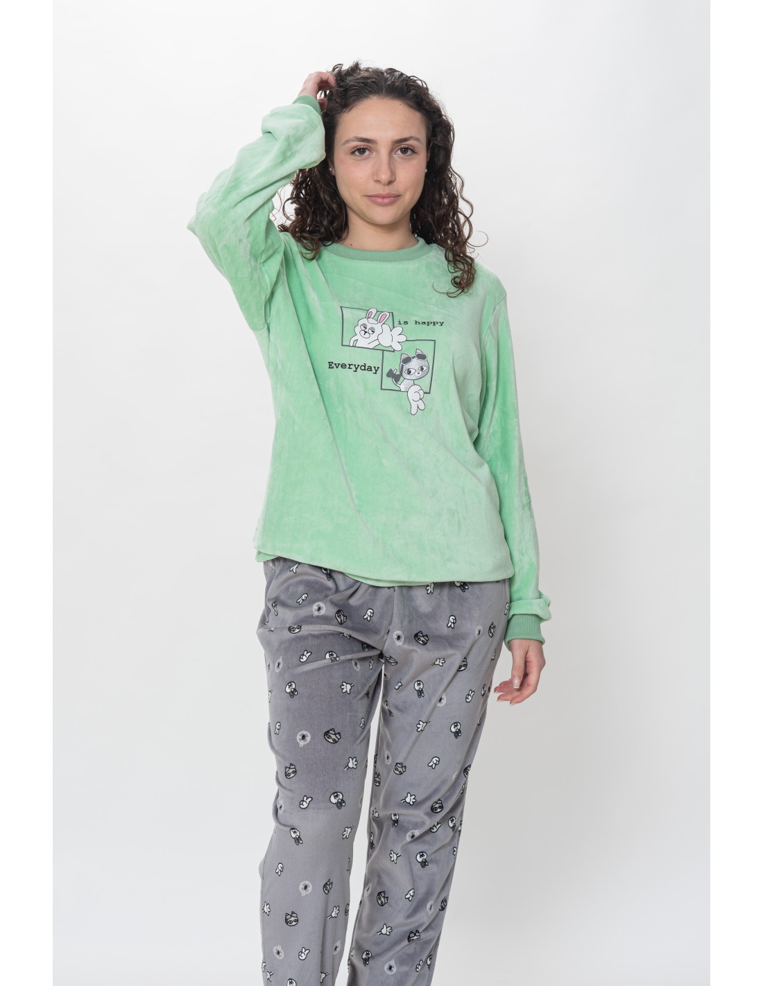 Pijama de invierno para mujer compuesto por camiseta de color verde con dibujo de animalitos saludando y pantalón de color gris con estampado.