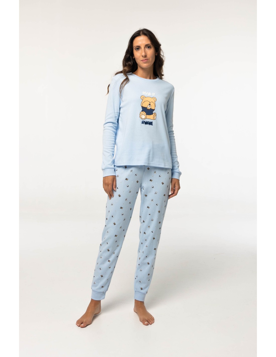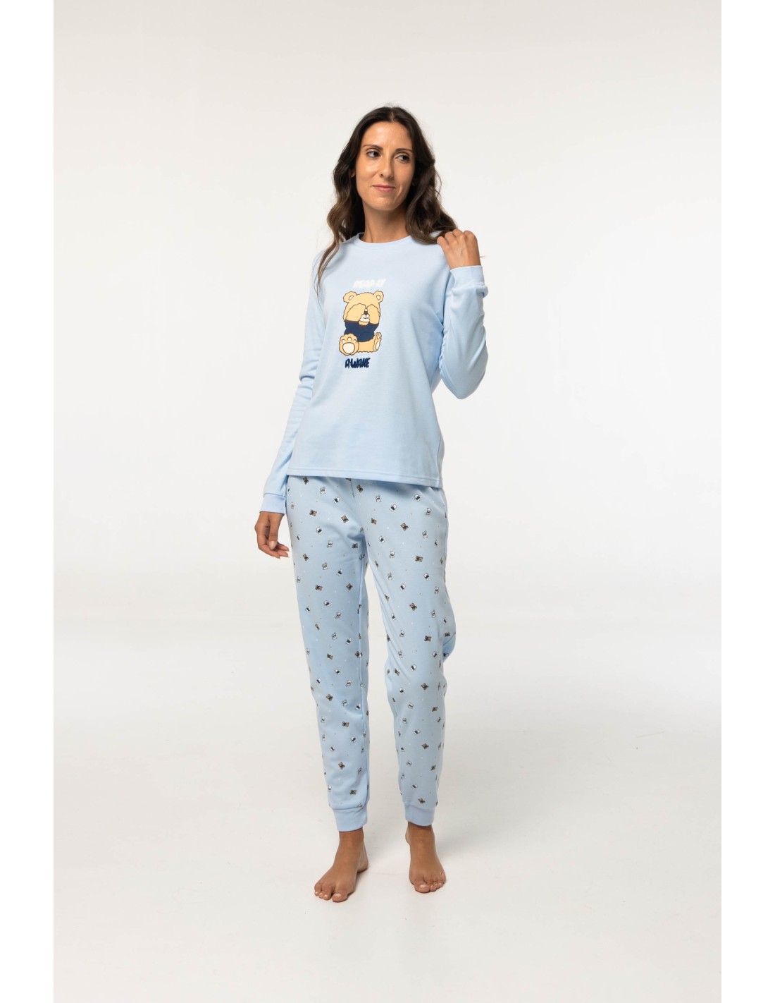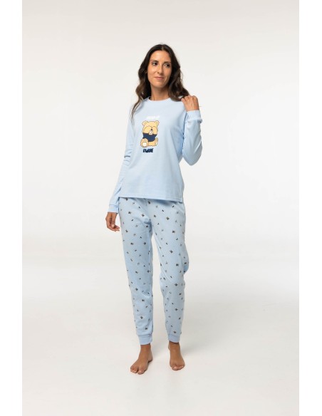 Pijama de algodón afelpado para mujer compuesto por camiseta con dibujo de osito de peluche y texto con borreguillo; y pantalón estampado de ositos de peluche.
