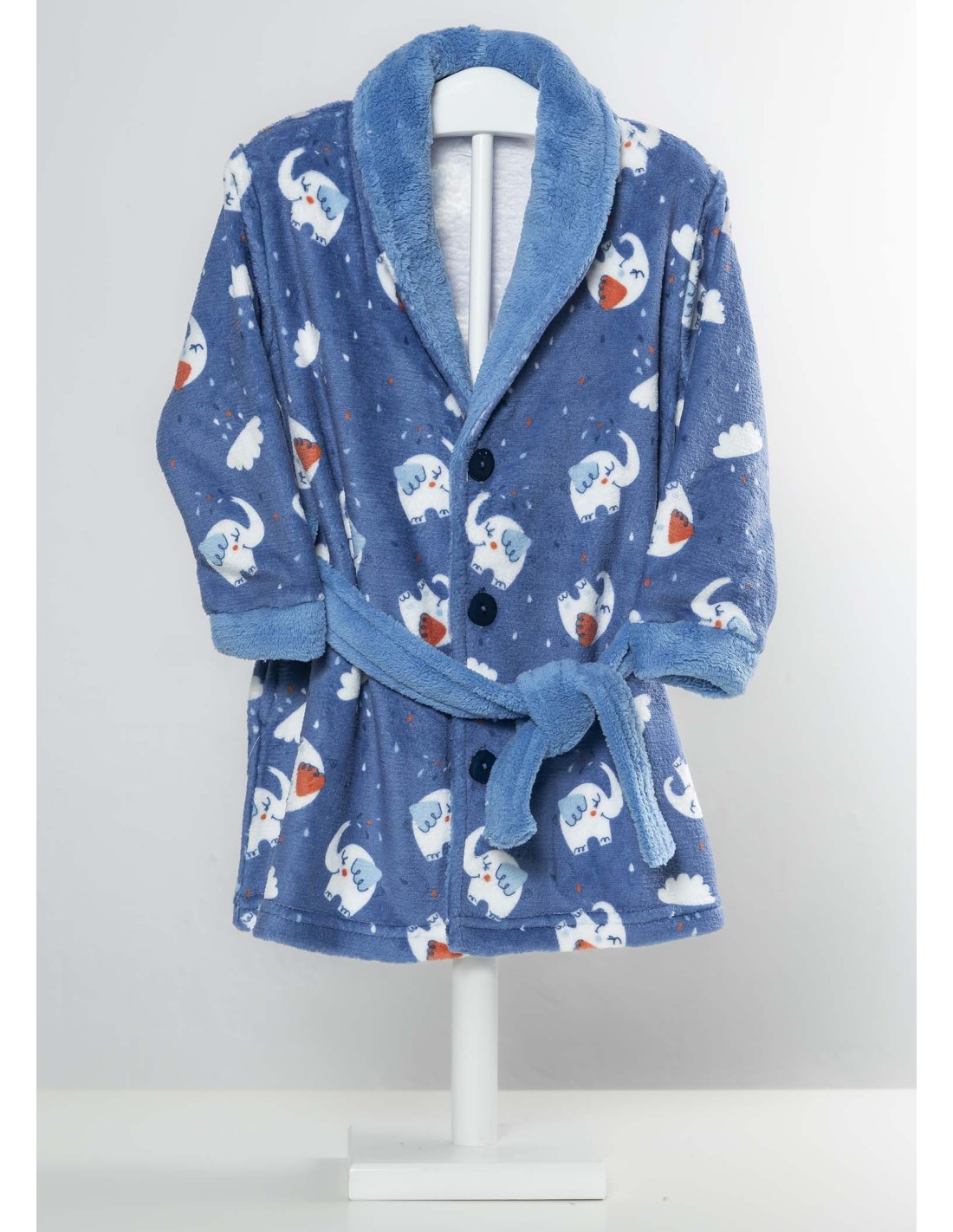 Bata de bebé de nacarina para estar por casa de color azul con estampado de elefantes y nubes.
