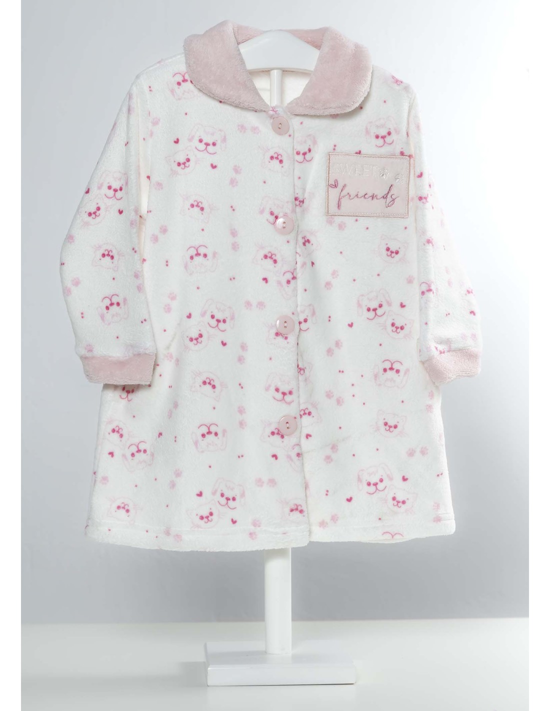 Bata de bebé de nacarina para estar por casa de color blanco con estampado de caritas de perro y gato, y bordado en el pecho con texto ''Sweet friends''.