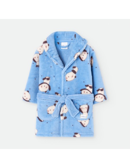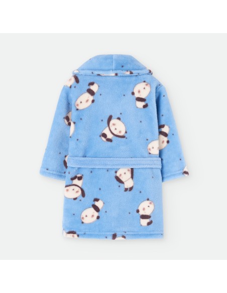 Bata de bebé para estar por casa de color azul claro con estampado de osos panda.