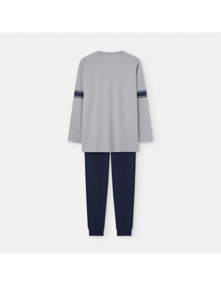 Pijama para hombre compuesto por camiseta con texto central y detalle de brazalete en las mangas; y pantalón liso de color marino.