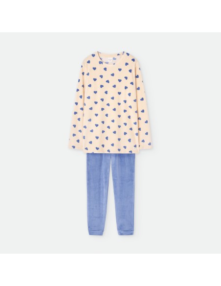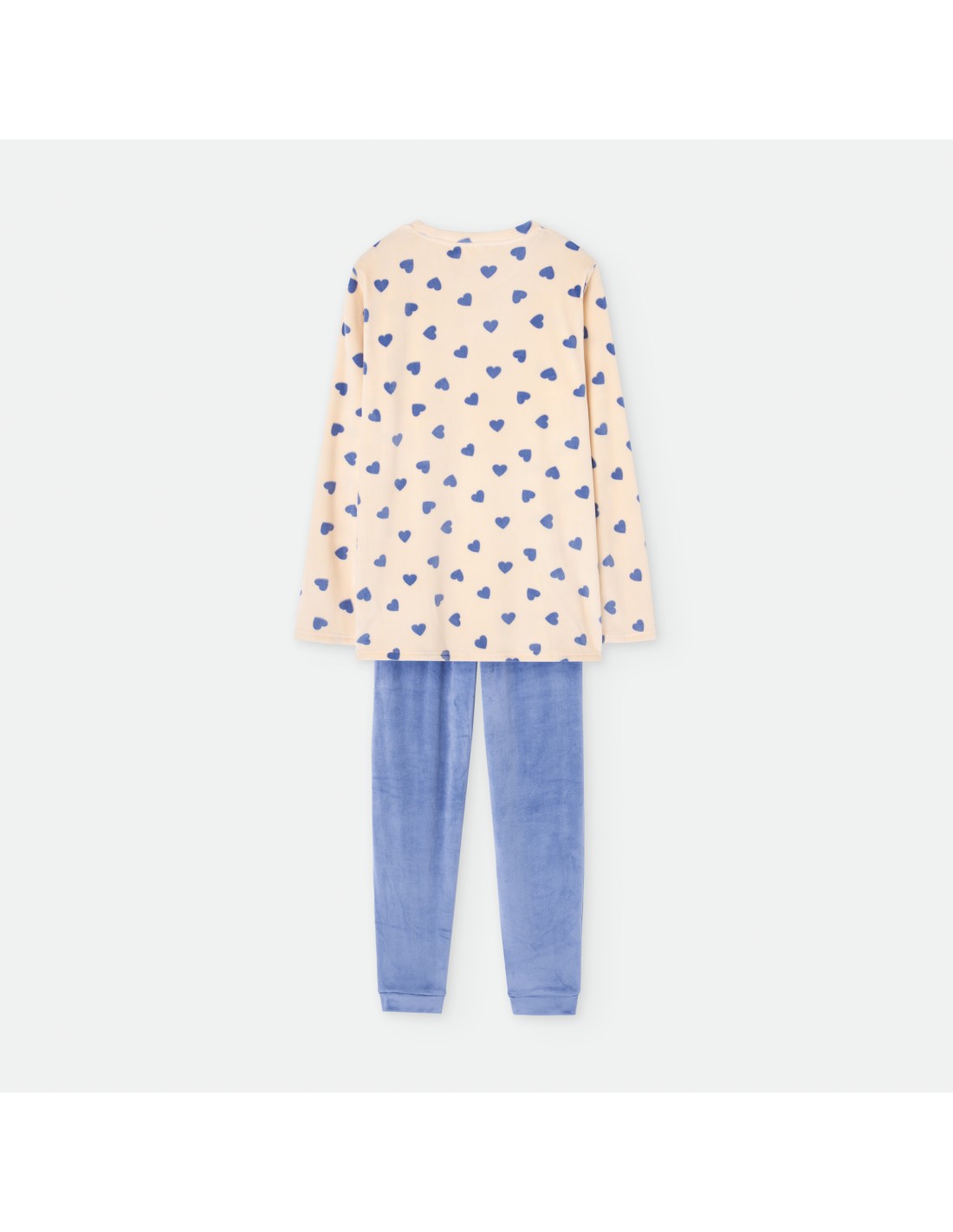 Pijama elástico de terciopelo para mujer compuesto por camiseta con estampado de corazones y pantalón liso.
