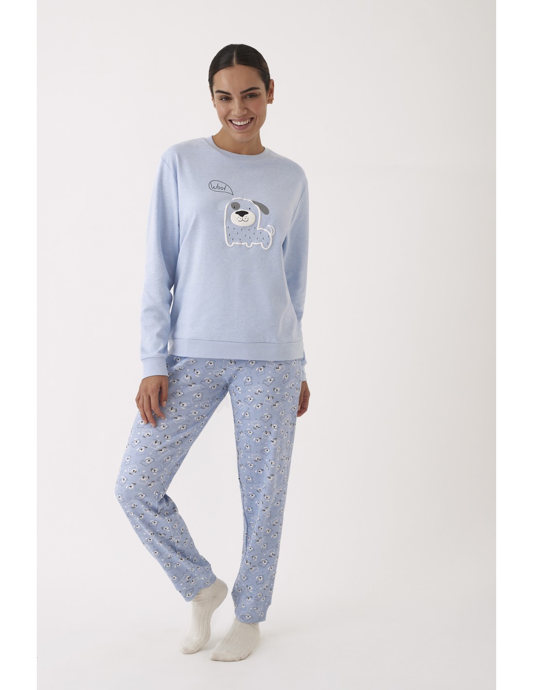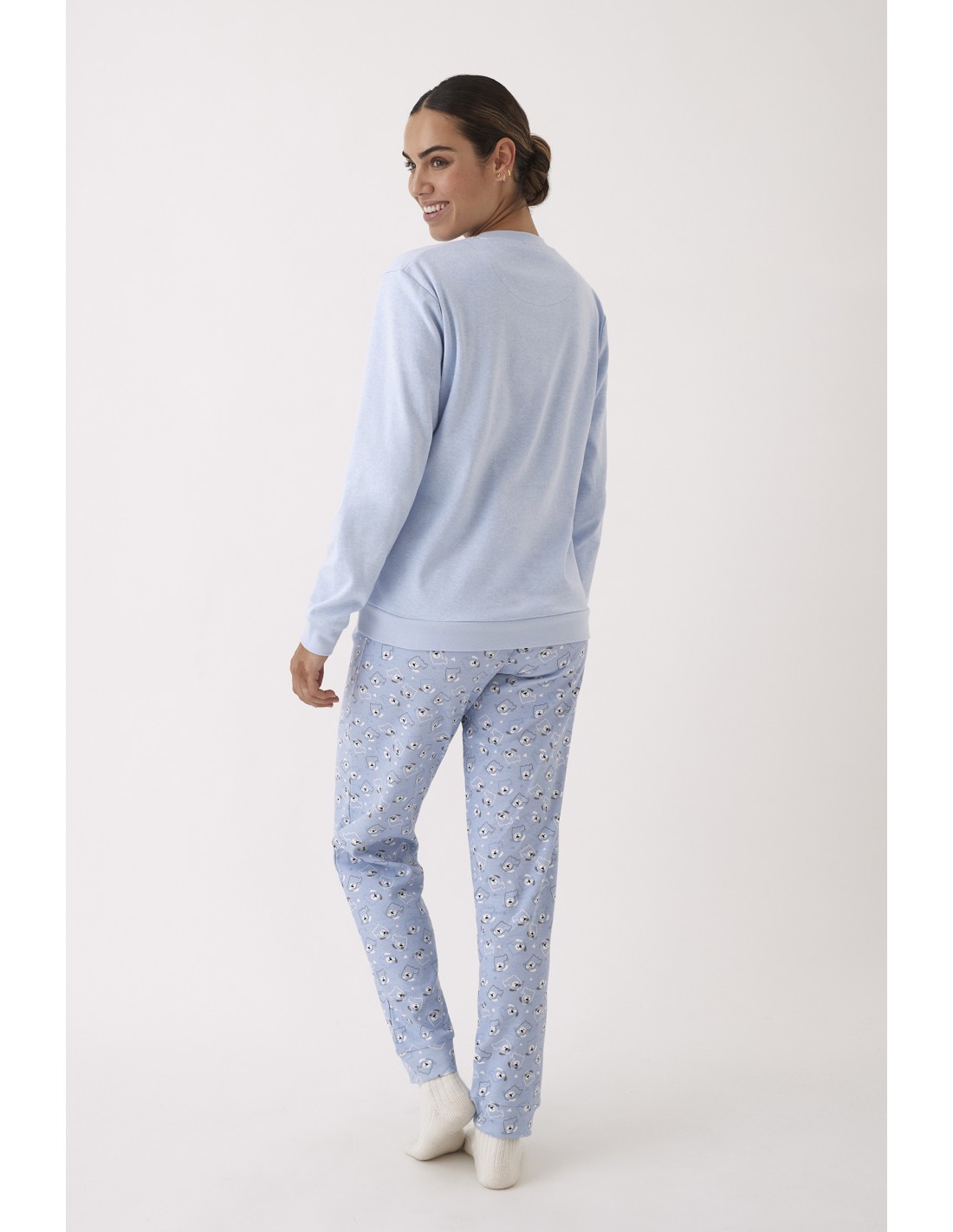 Compuesto de sudadera de pijama de color celeste con dibujo de perrito y pantalón azul estampado de perritos.