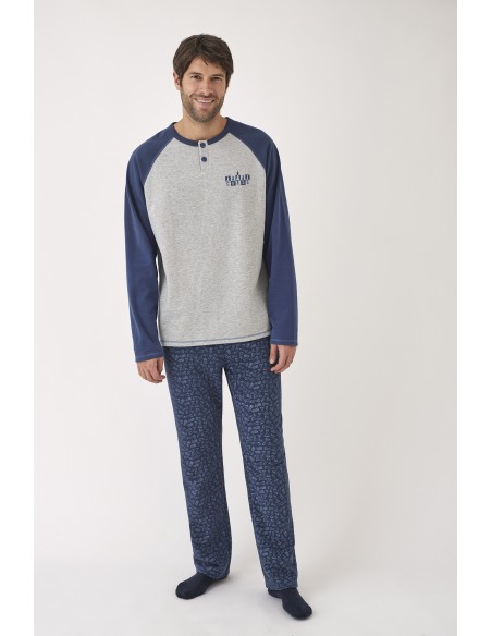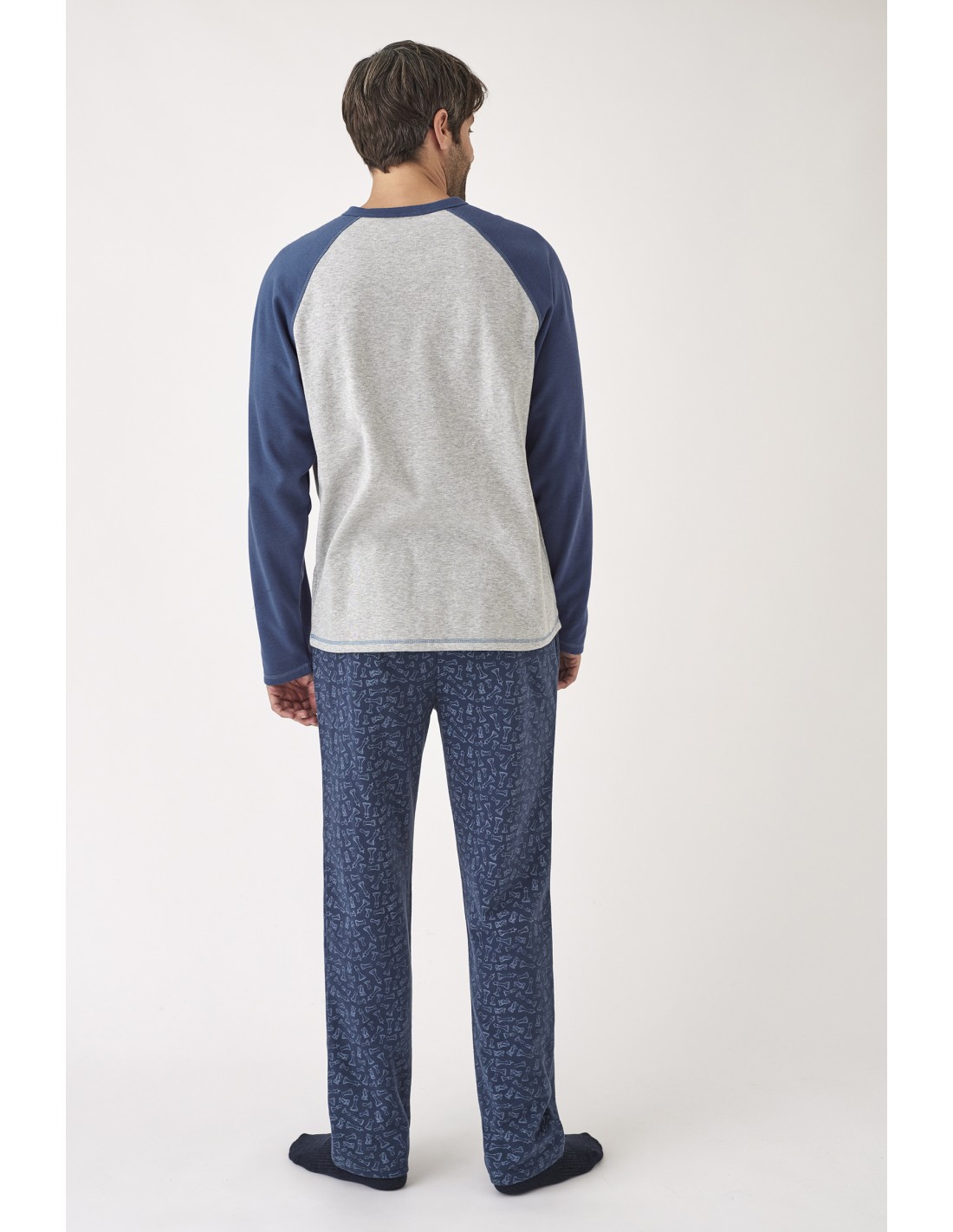 Compuesto de camiseta de pijama de color gris con pequeño dibujo de ajedrez y mangas azules; y pantalón azul estampado de piezas de ajedrez.