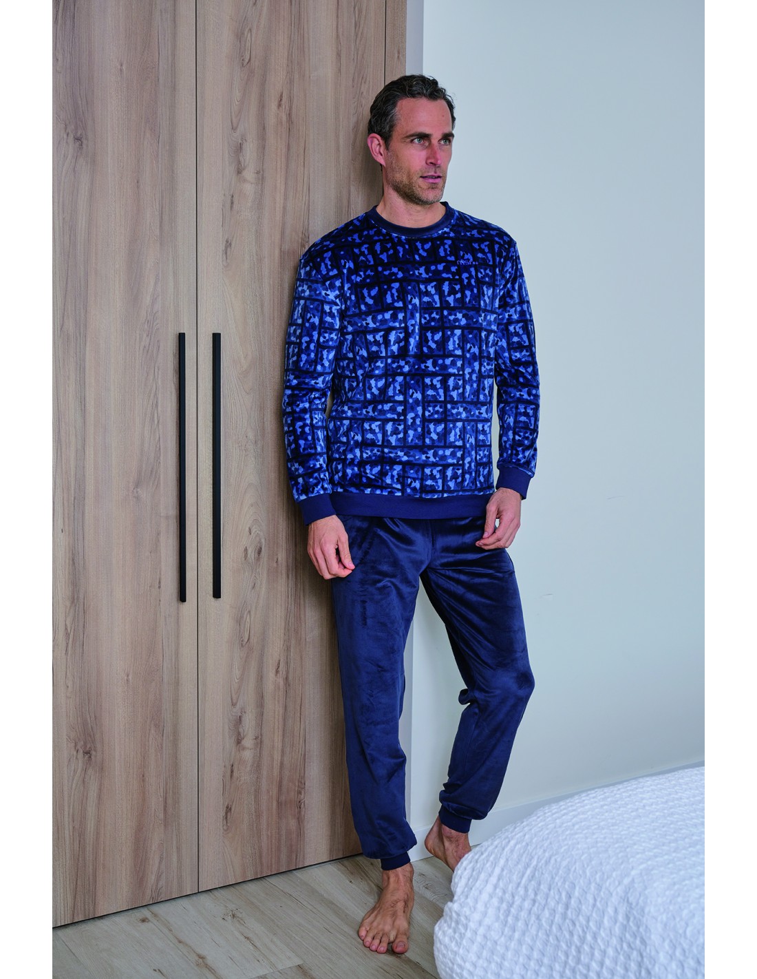 Pijama para hombre de spandex compuesto por camiseta de pijama estilo camuflaje en tonos azules y pantalón liso de color marino.