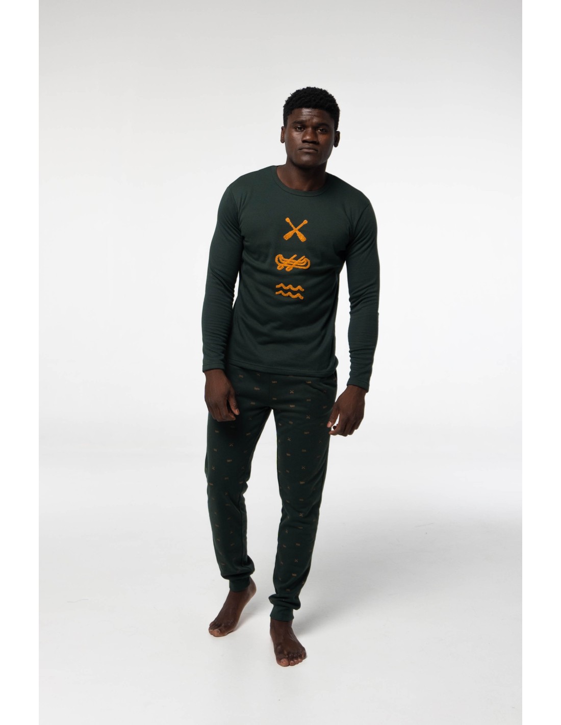Pijama para hombre de algodón afelpado compuesto por camiseta con dibujo de canoa, remos y olas en relieve de borreguillo; y pantalón estampado de motivos marinos.