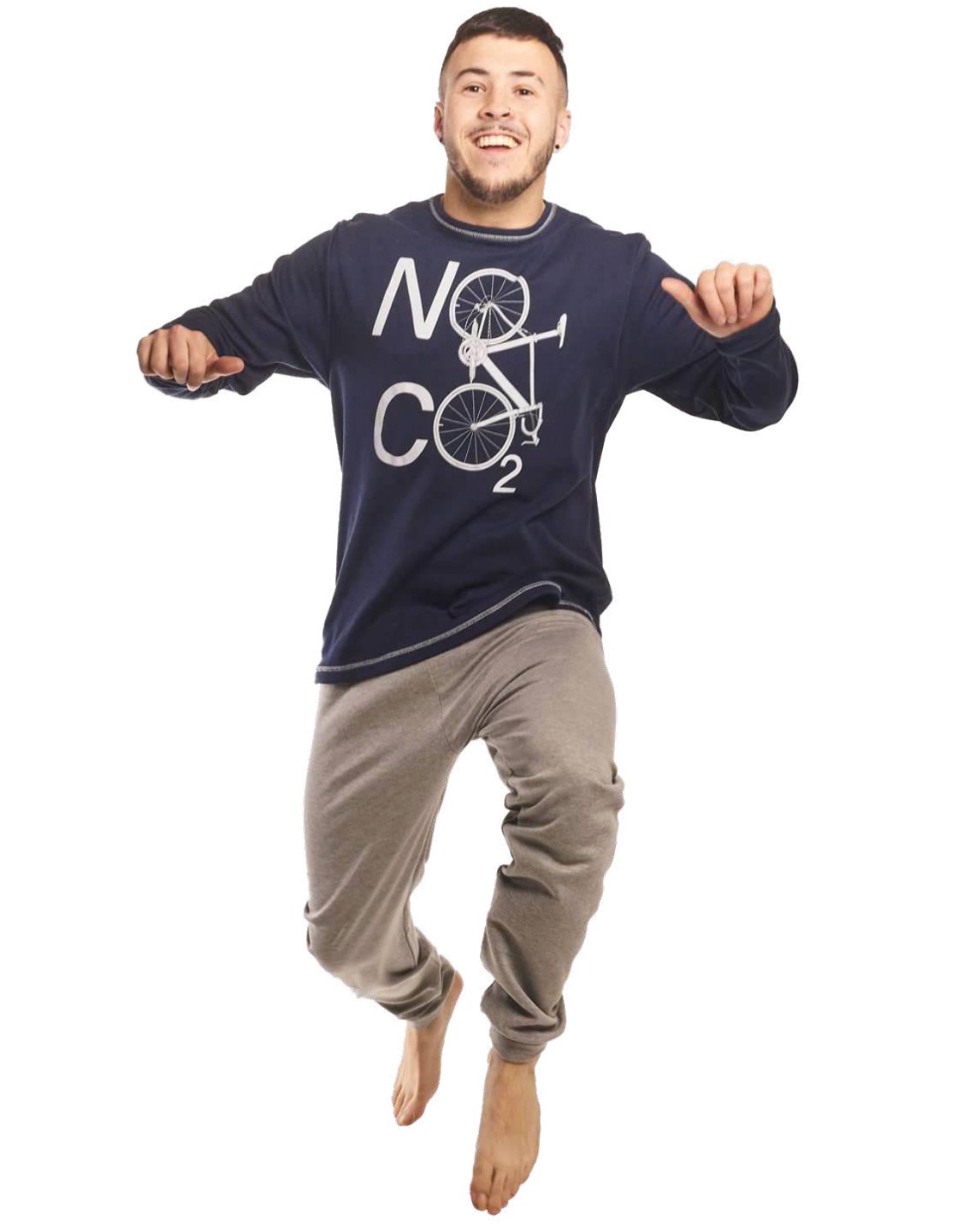 Pijama para hombre de algodón afelpado compuesto por camiseta con dibujo de bicicleta y pantalón liso de color gris.