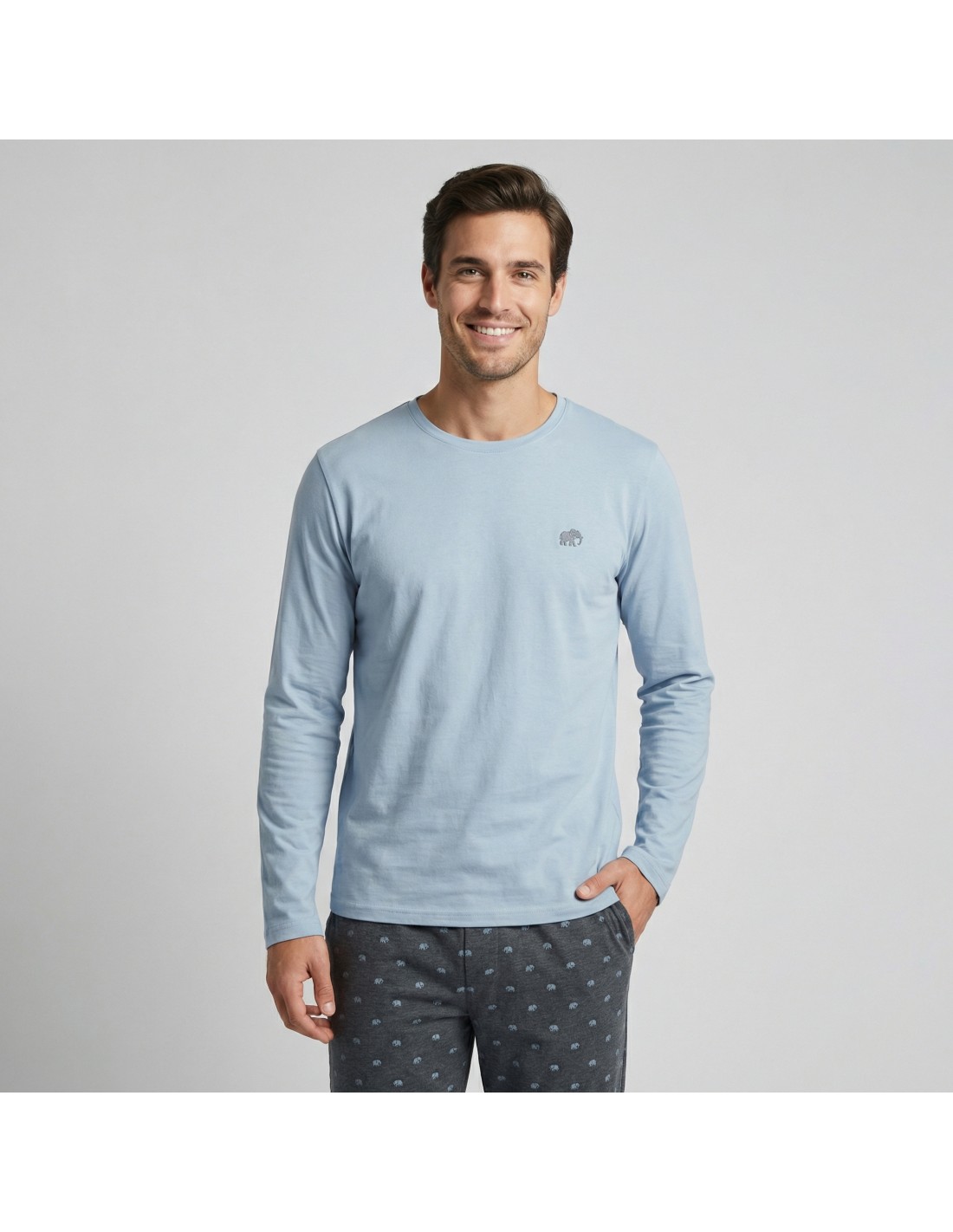 Pijama para hombre compuesto por camiseta con pequeño dibujo de elefante en el pecho y pantalón estampado de elefantes.