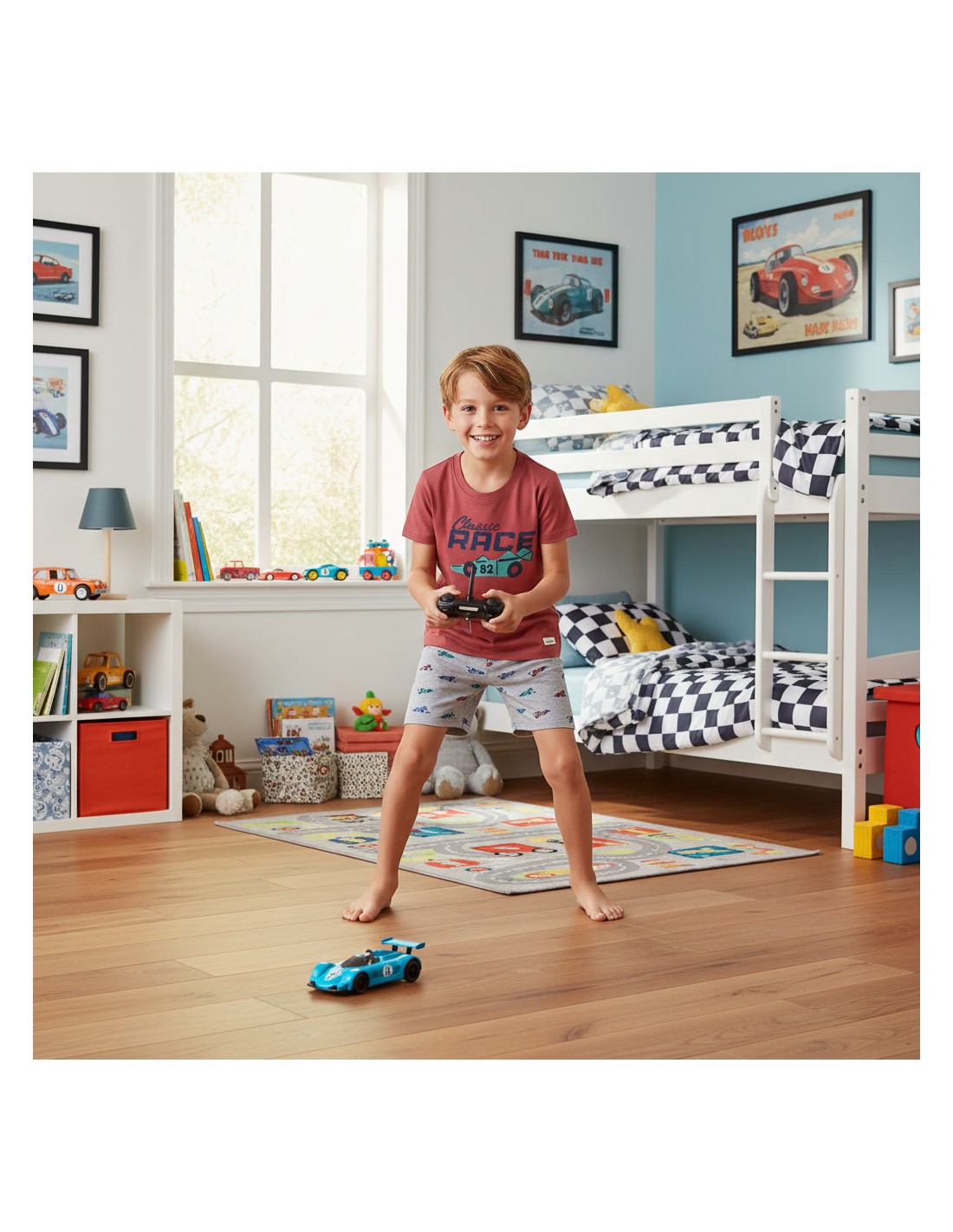 Pantalón estampado de coches de carreras.