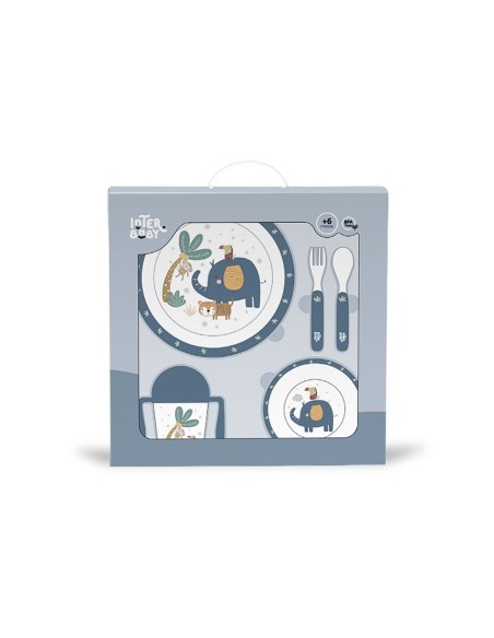 - Plato grande con borde azul y dibujos de animales de la sabana.