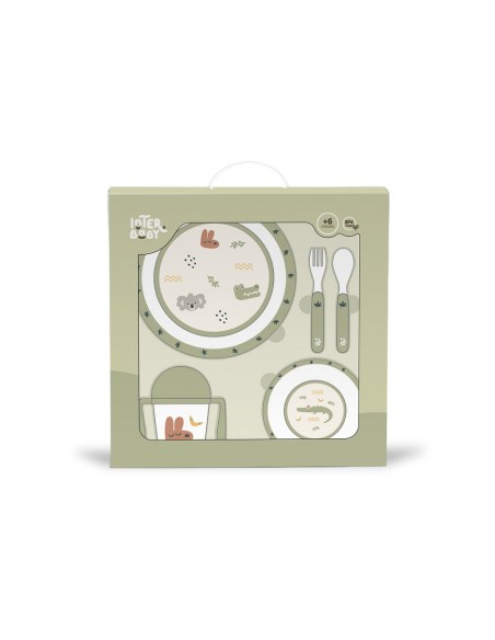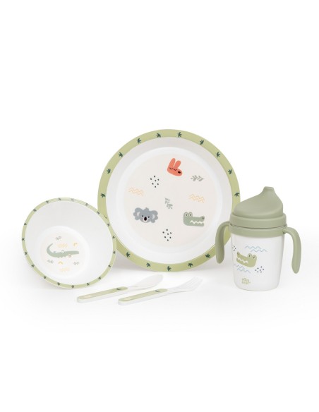 - Plato grande con borde verde y dibujos decocodrilo, koala y conejo.