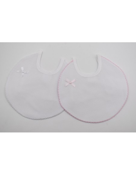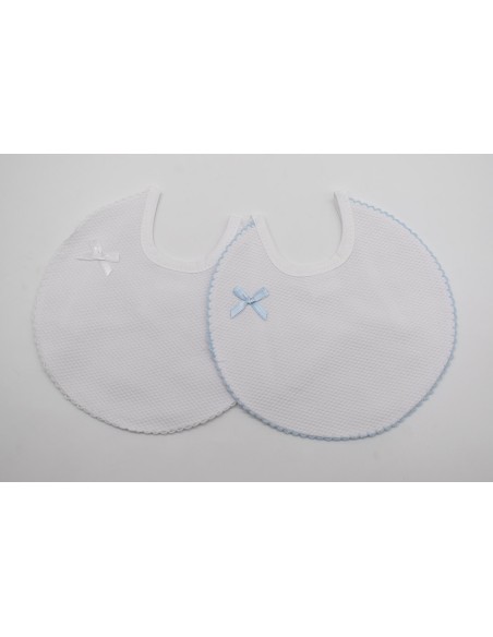 Babero redondeado de piqué con puntilla en el contorno y lazo decorativo.