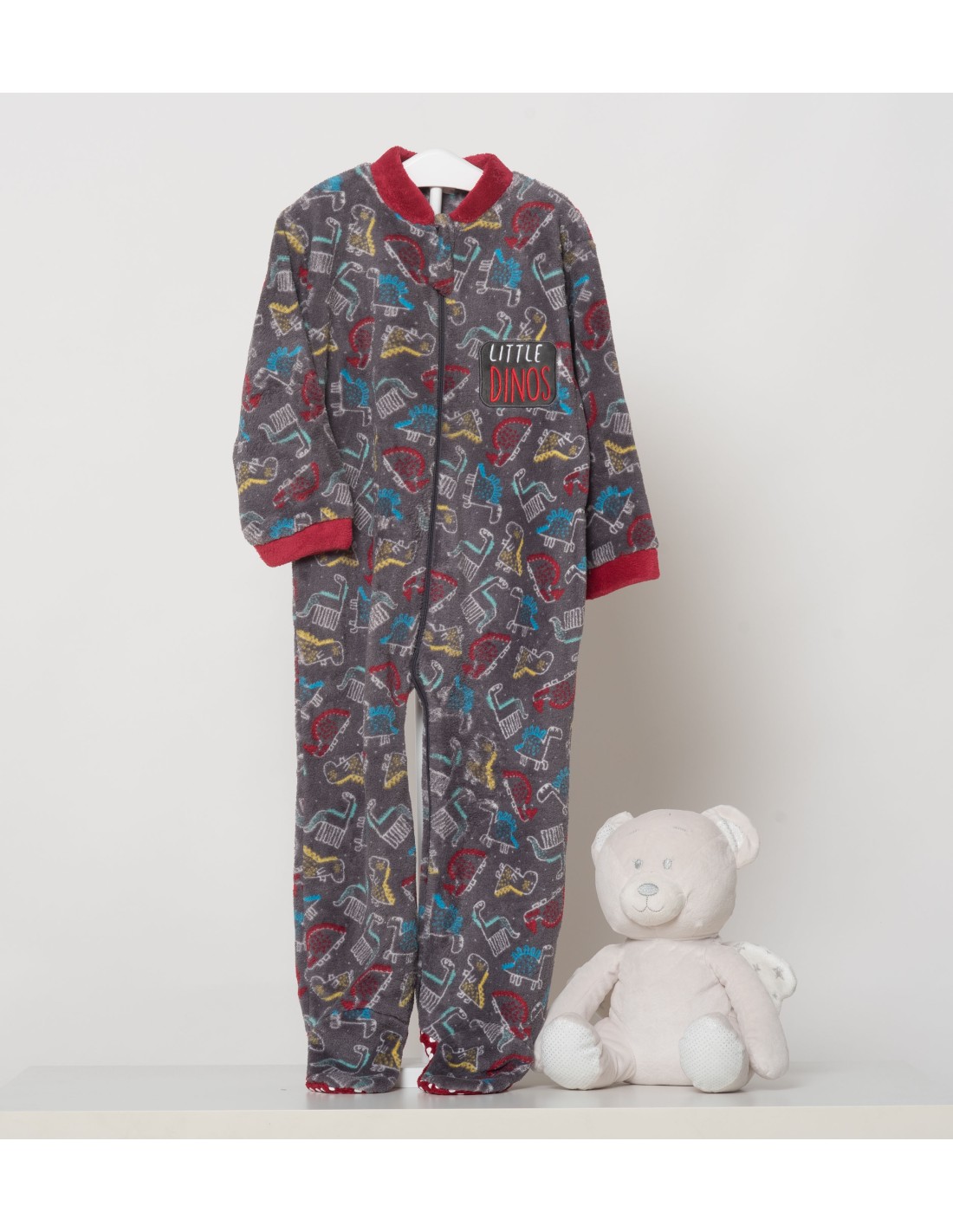 Pelele infantil dormilón de nacarina modo manta con abertura de cremallera y pies acolchados, marca Kinanit. Color gris con puños y cuello color rojo y estampado de dinosaurios.