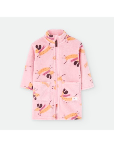Bata infantil para estar por casa de color rosa con estampado de perritos.