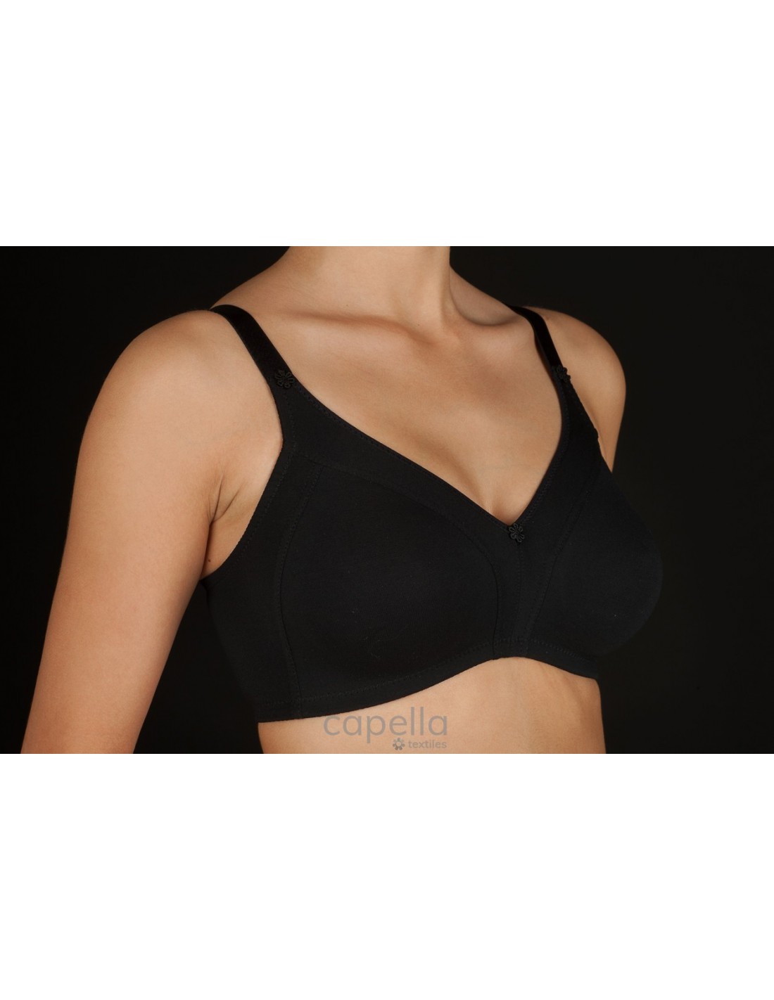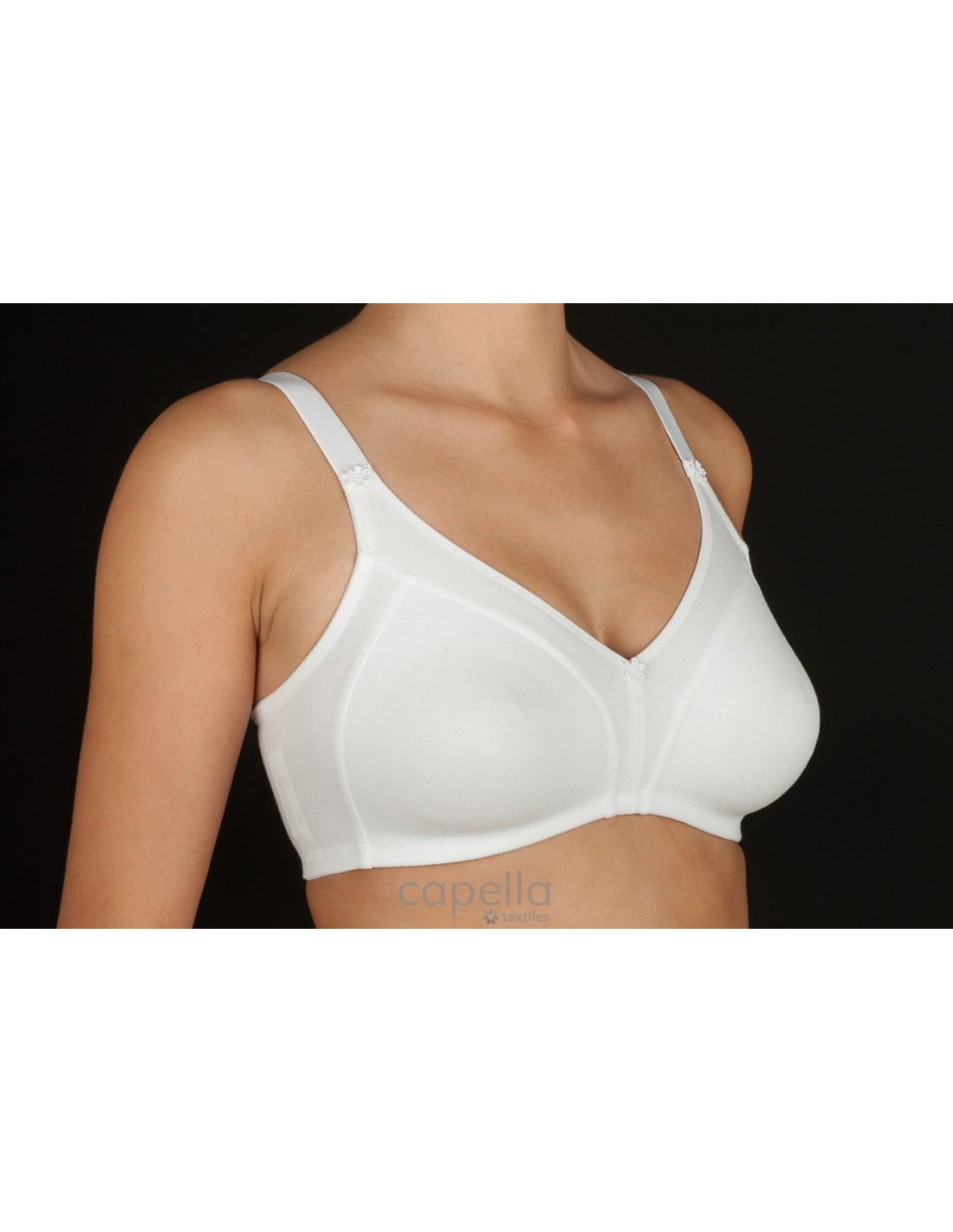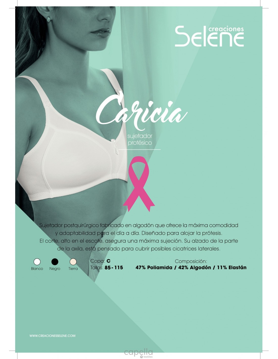 Sujetador protésico de algodón con bolsillo interior para alojar de forma segura las prótesis.
