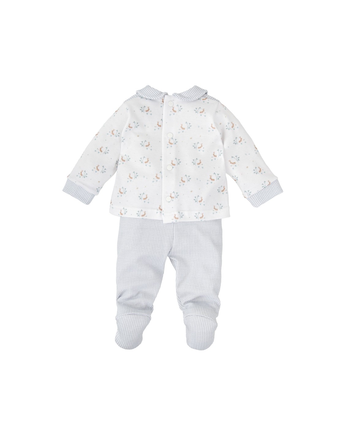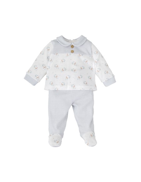 Conjunto de 2 piezas para bebé compuesto por camiseta estampada de conejitos y ramilletes; y polaina a cuadros.