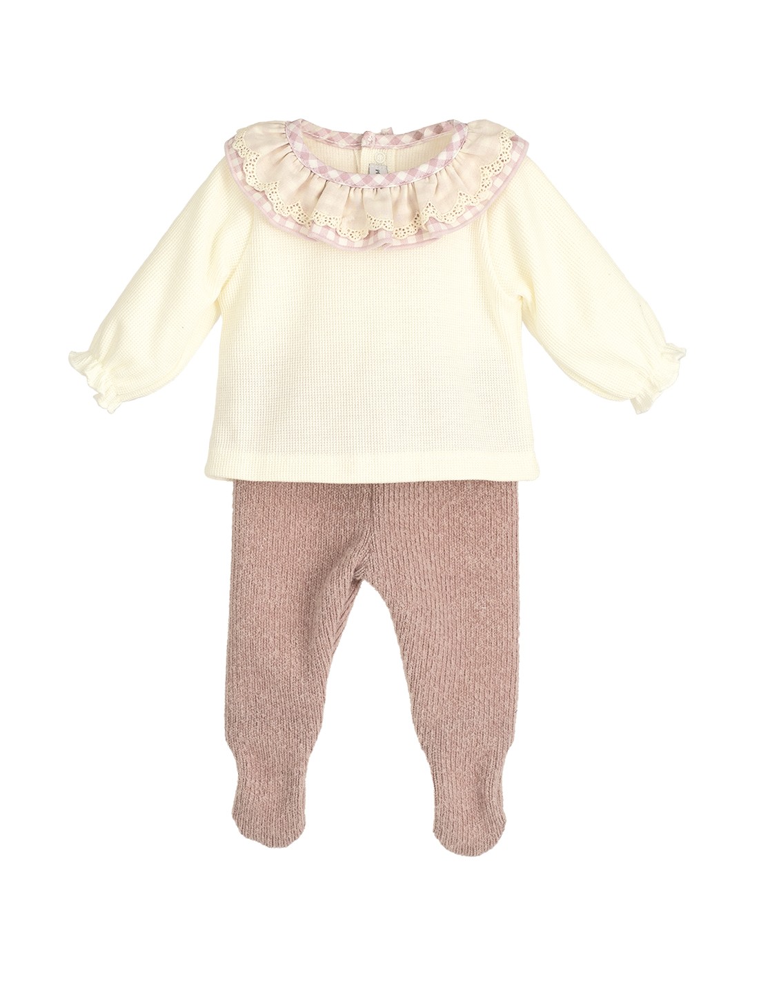 Conjunto de 2 piezas para bebé compuesto por camiseta con volantes de puntilla en el cuello ; y polaina de color nude.