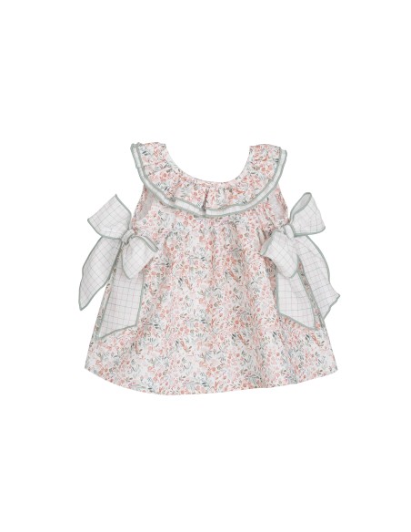 Con lazos laterales con estampado de cuadros y cuello de volantes.