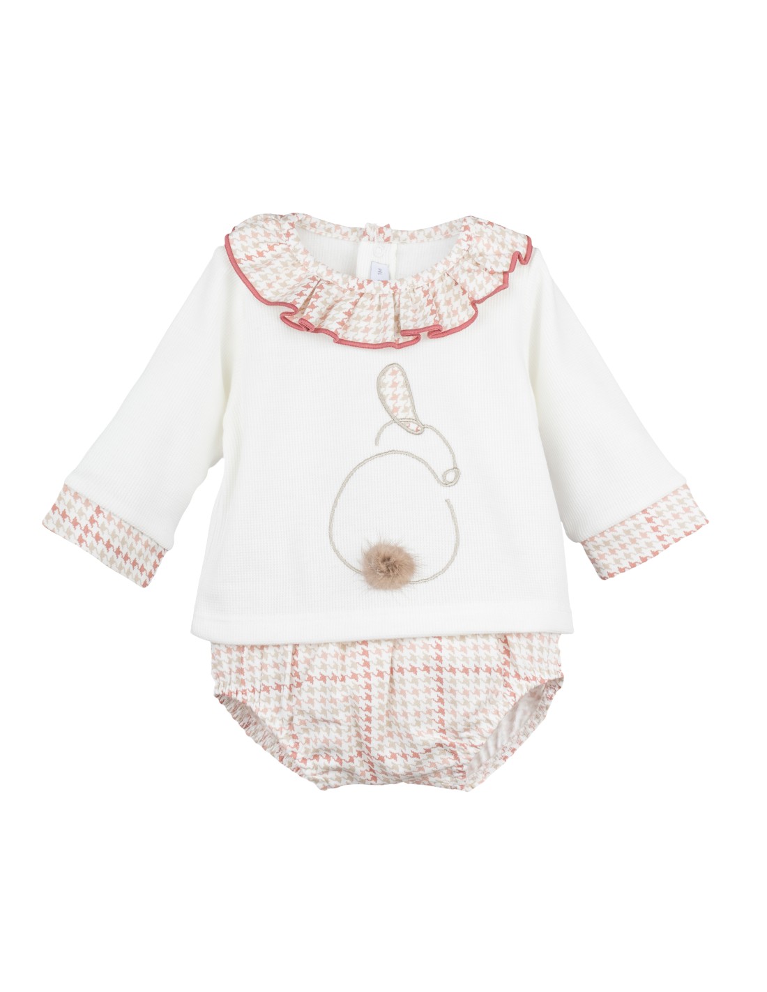 Conjunto de pololo modelo Genil con 2 piezas para bebé. Compuesto por camiseta de color blanco con dibujo central de conejito con pequeño pom pom y volantes en la parte inferior; y pololo estampado.
