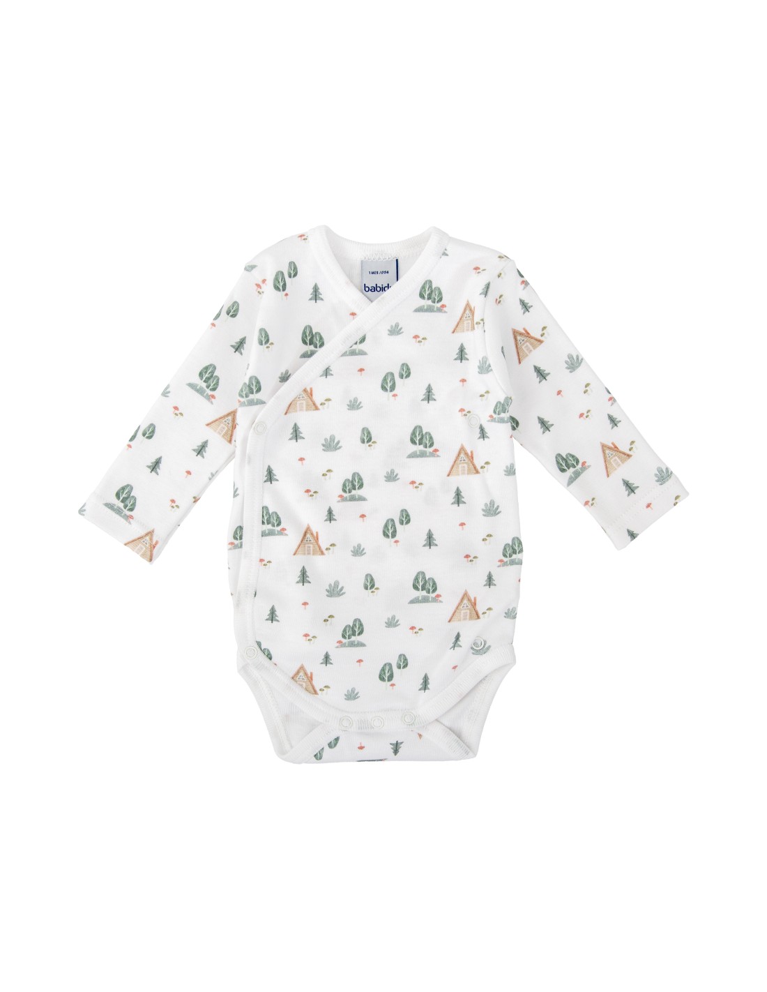 Pack de regalo para bebé compuesto por: jubón y polaina estampados de bosque, body, gorrito y manoplas a juego.