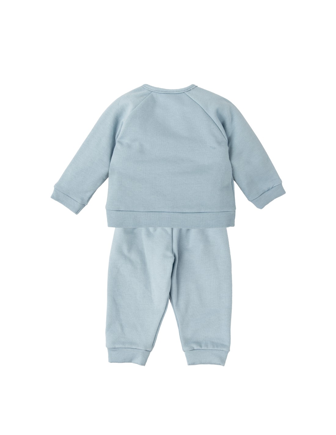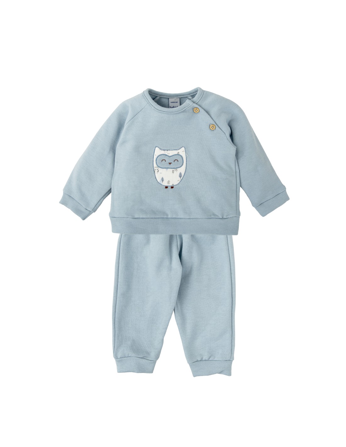 Chándal afelpado compuesto por camiseta de color azul empolvado con bordado central de búho y pantalón de color azul empolvado con puño.