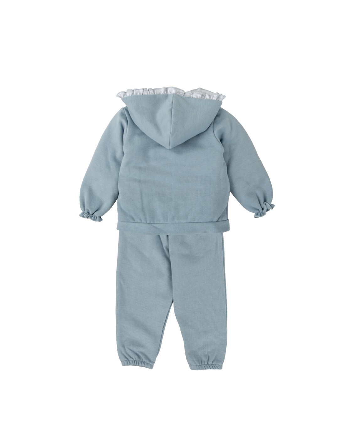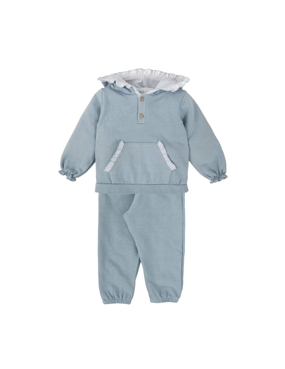 Chándal compuesto por sudadera con capucha de color azul con bolsillo central y pantalón de color azul con goma.