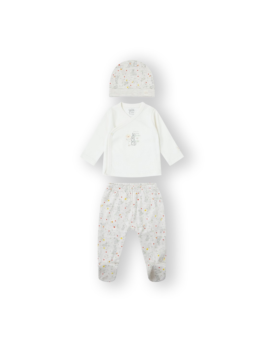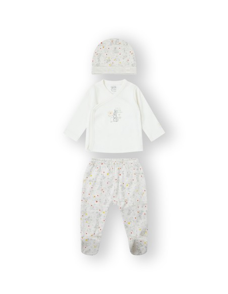 Conjunto de 3 piezas para bebé compuesto por jubón con dibujo de conejito, polaina de color crudo con estampado de conejitos y gorrito a juego.
