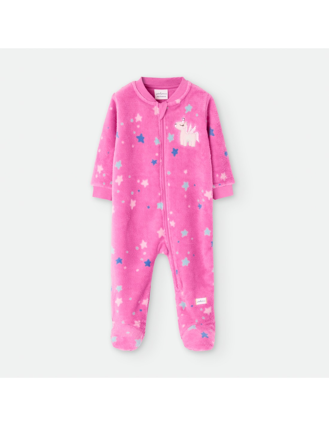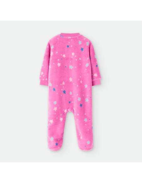 Pelele dormilón para bebé de la marca Waterlemon. De color rosa con estampado de estrellas y dibujo de unicornio.