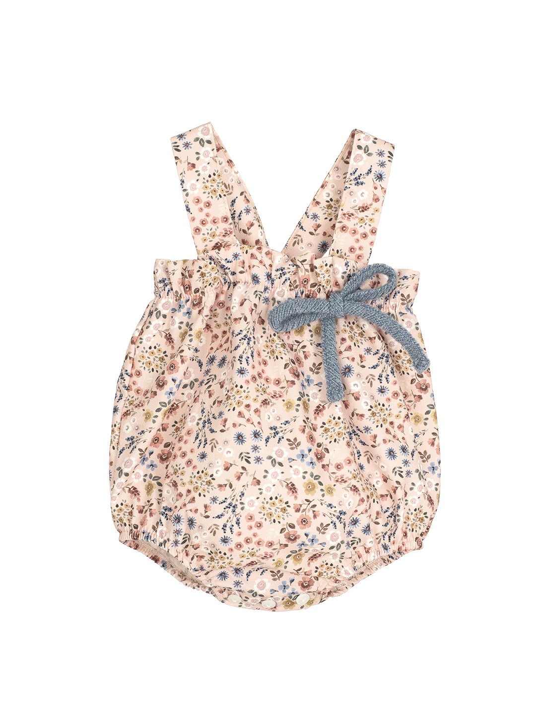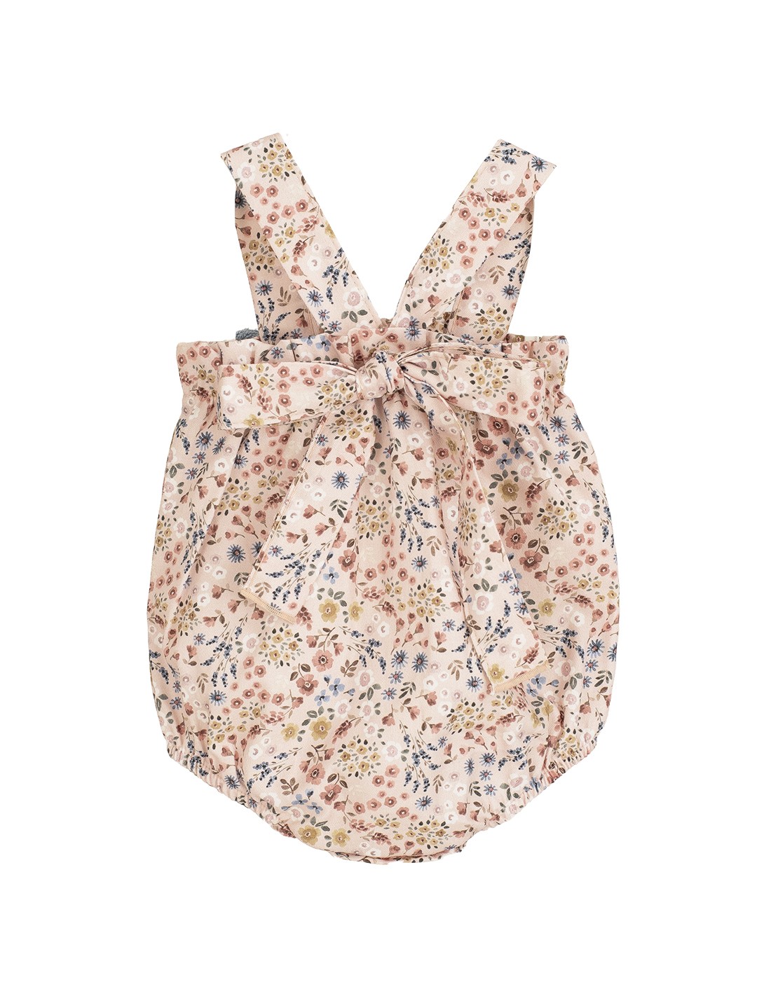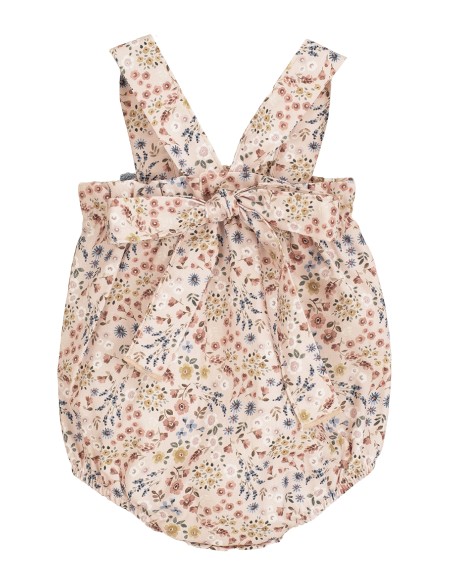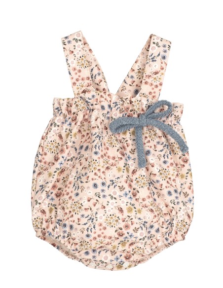 Peto modelo Poniente para bebé. Estampado de flores con lazo de color azul. Lazo trasero a juego con el peto.
