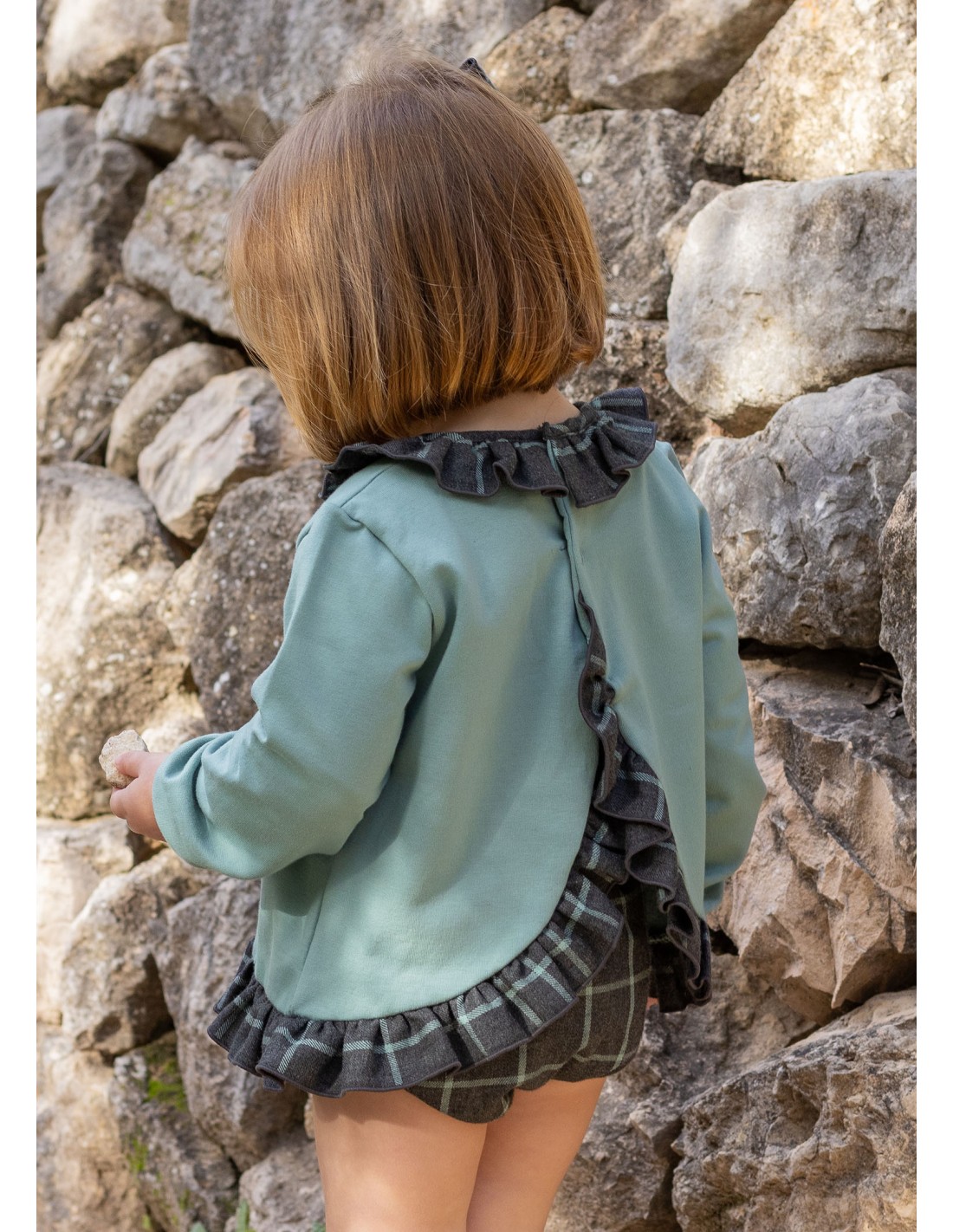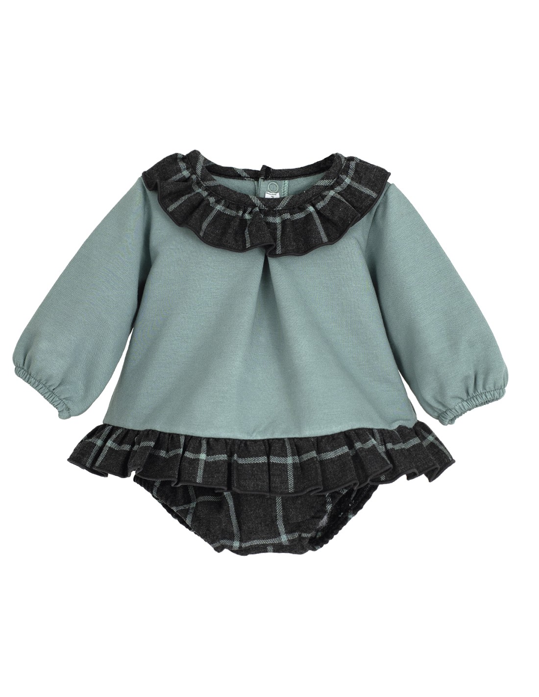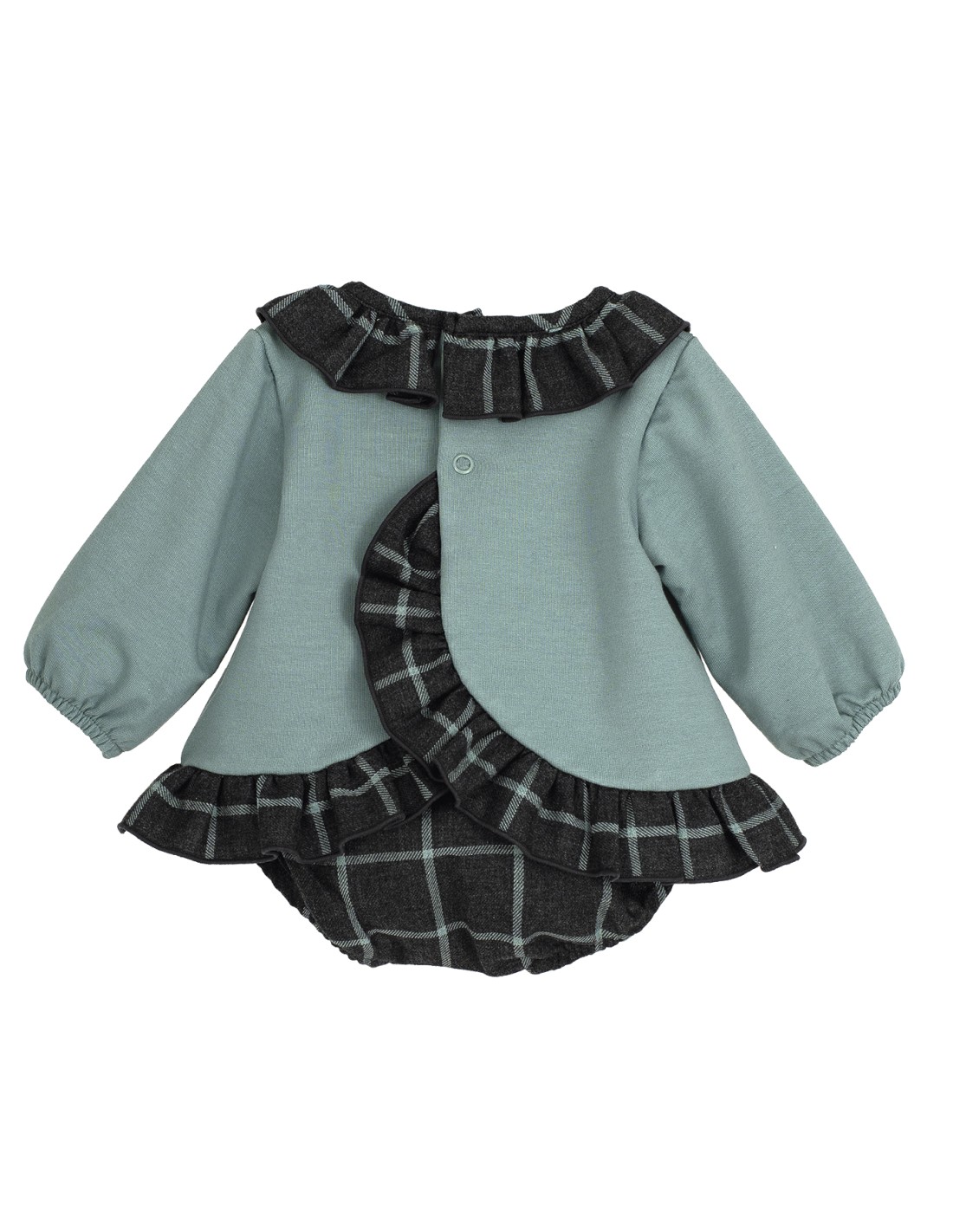 Jesusito modelo Zonda con 2 piezas para bebé. Compuesto por vestido de color mint con cuello, parte baja y trasera de volantes a cuadros; y braguita a cuadros.