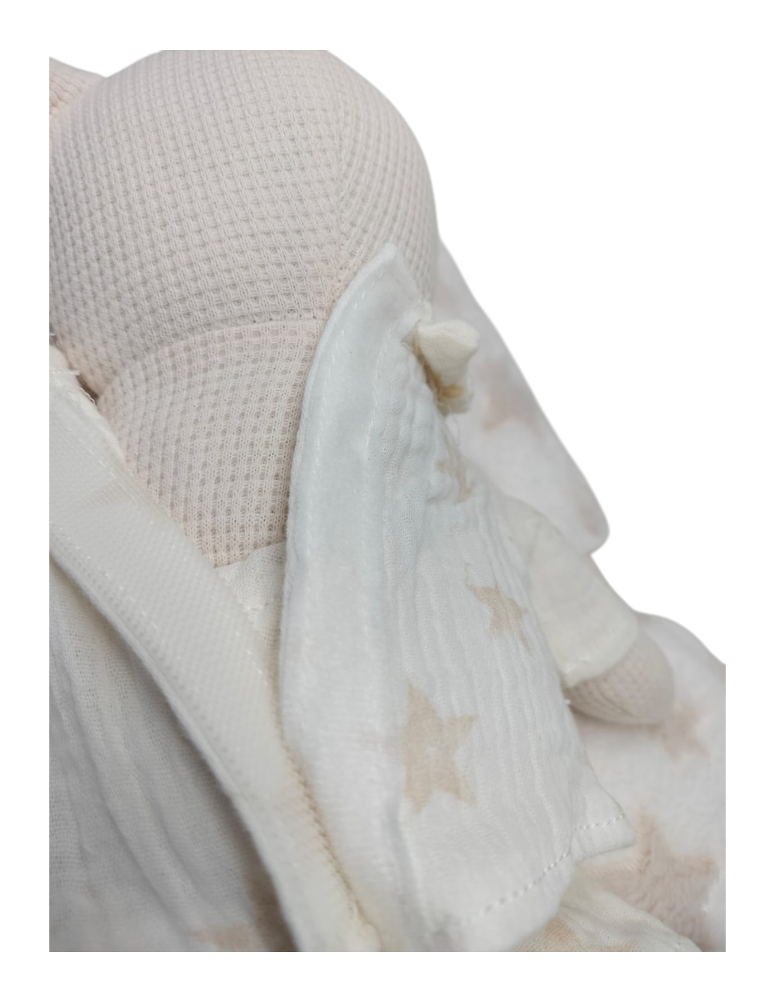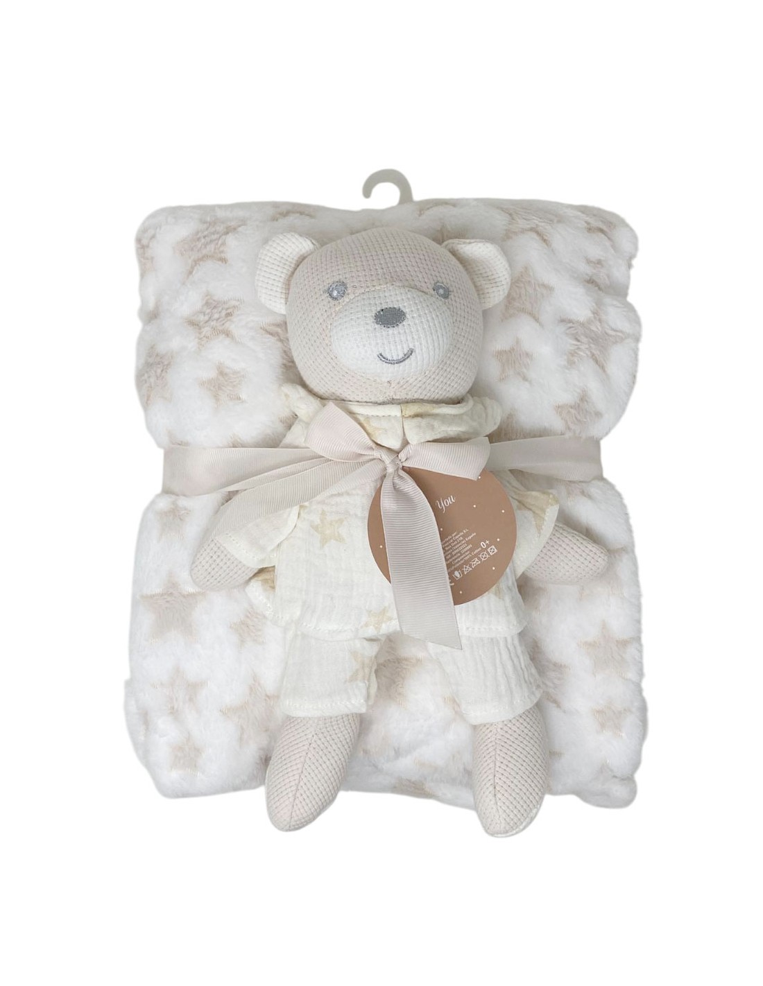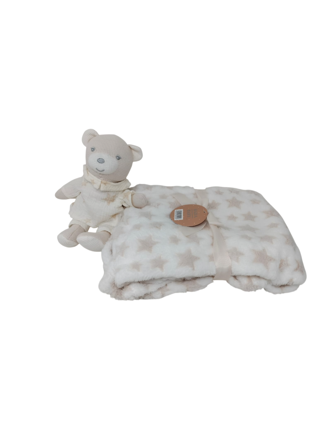 Set de regalo para bebé compuesto por: peluche de crochet con forma de osito y manta estampada de estrellas.