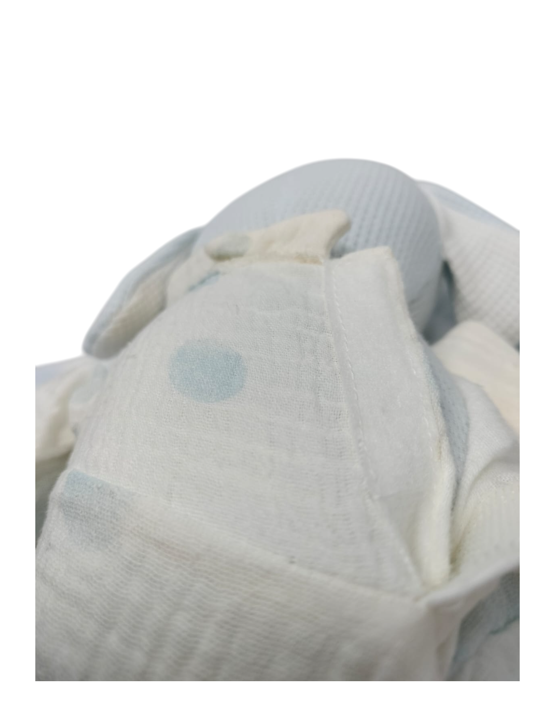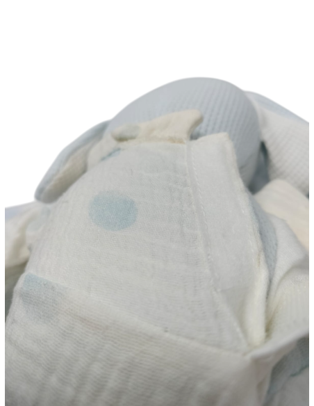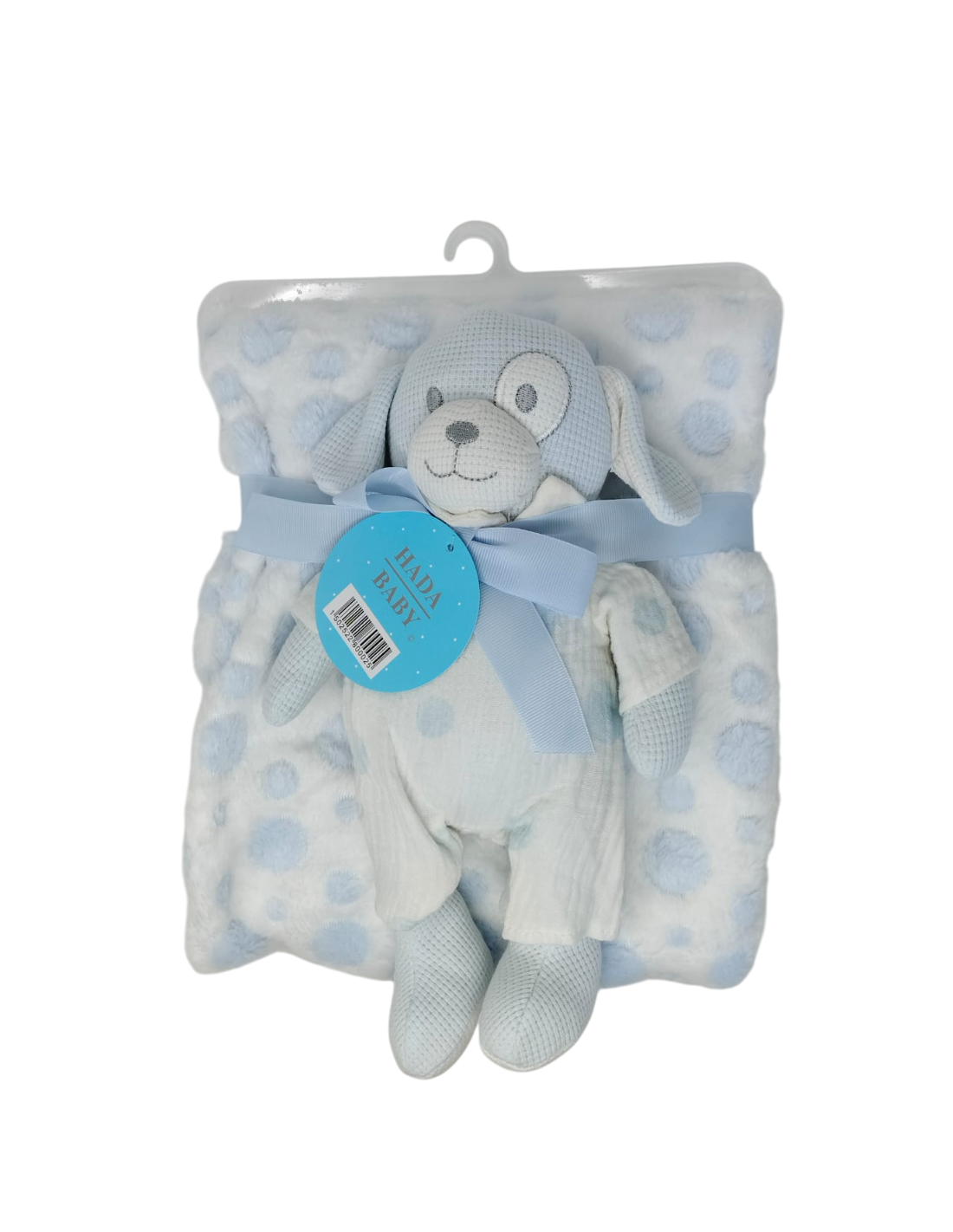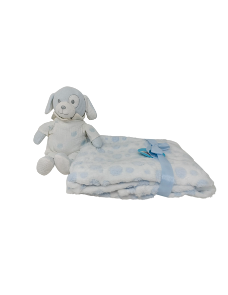 Set de regalo para bebé compuesto por: peluche de crochet con forma de perrito y manta estampada de lunares.