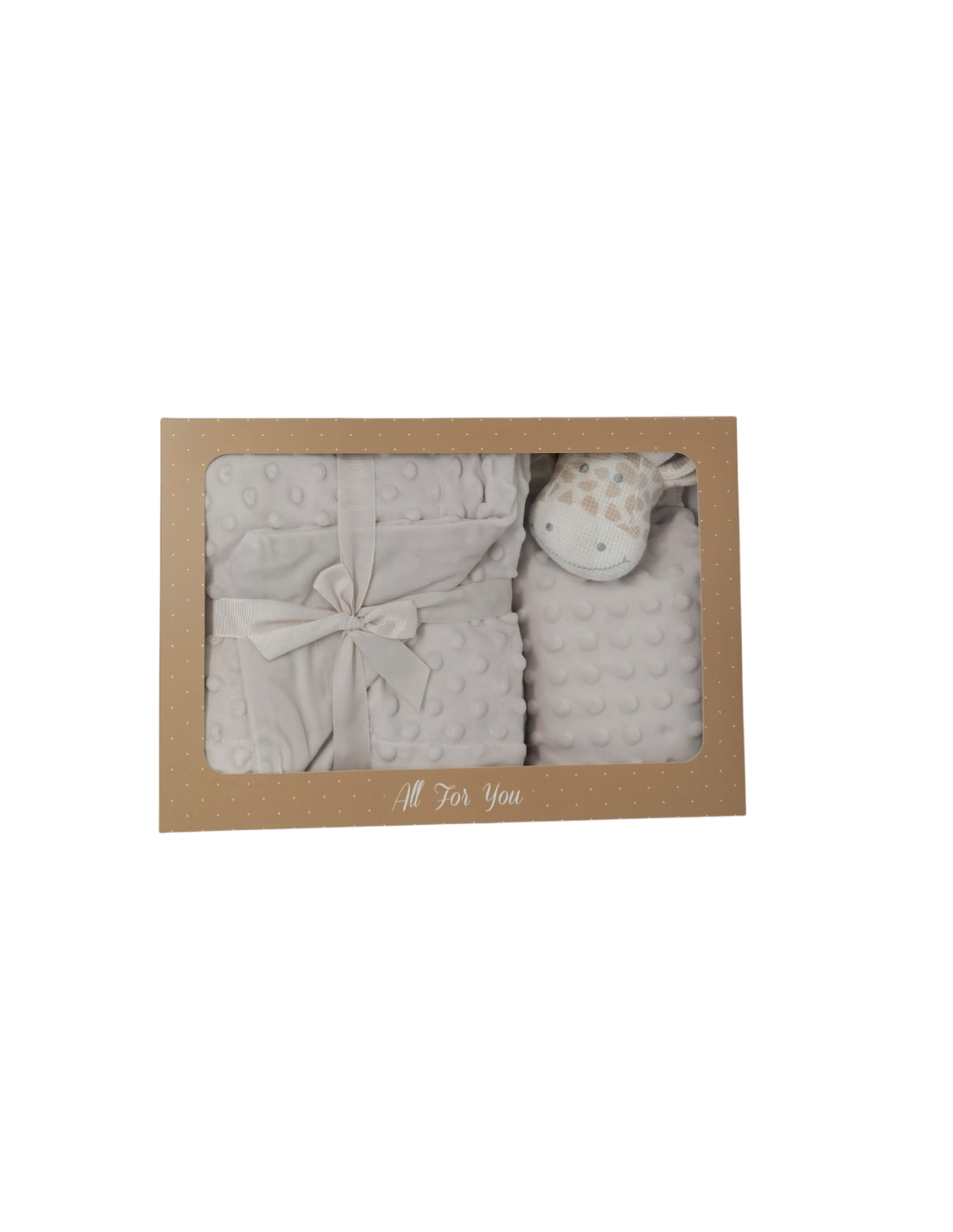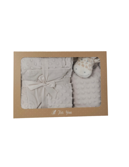 Caja con 12 sets de regalo compuesto por manta de topitos y dou dou de topitos con cabeza de crochet de jirafa.