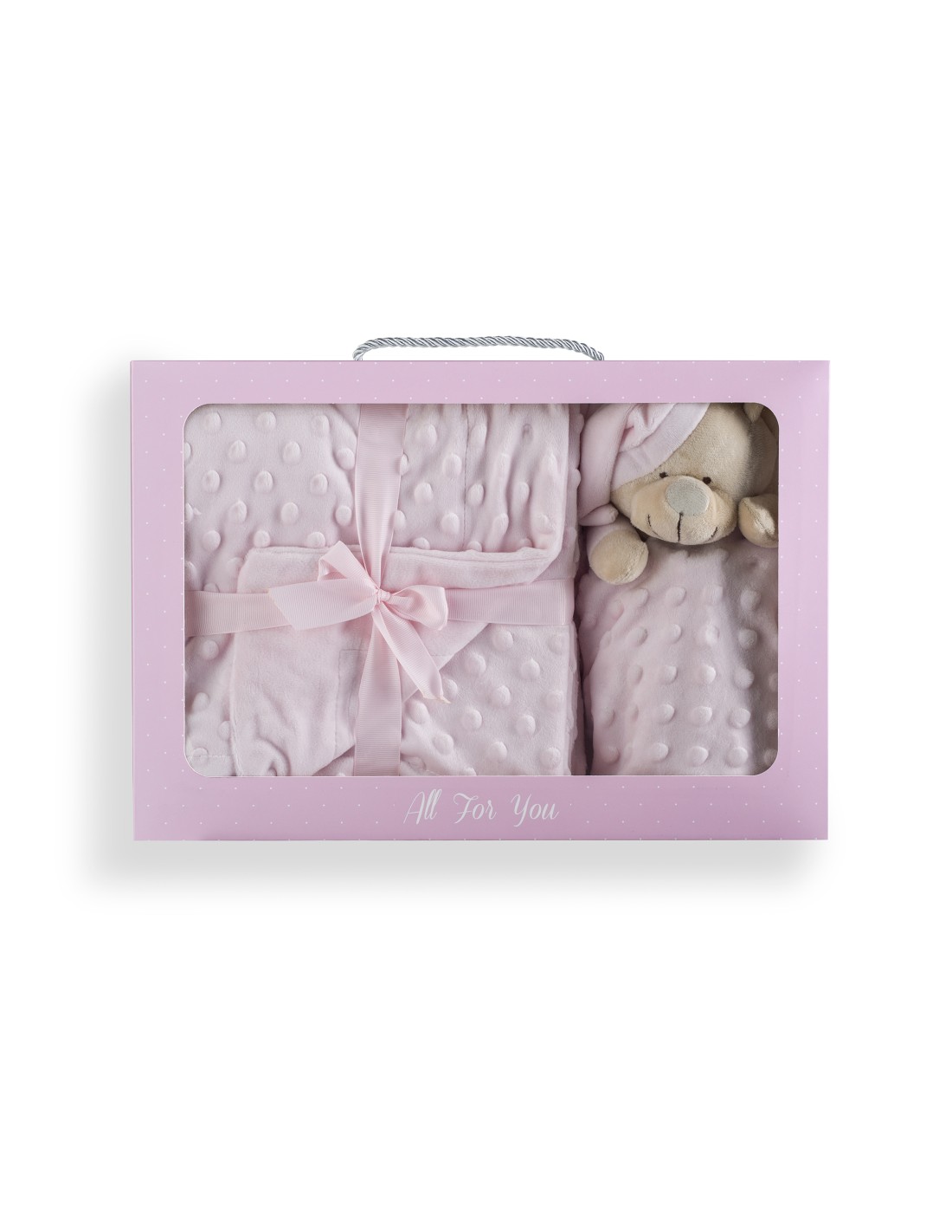 Set de regalo compuesto por manta de topitos y dou dou de topitos clásico, con cabeza de osito.