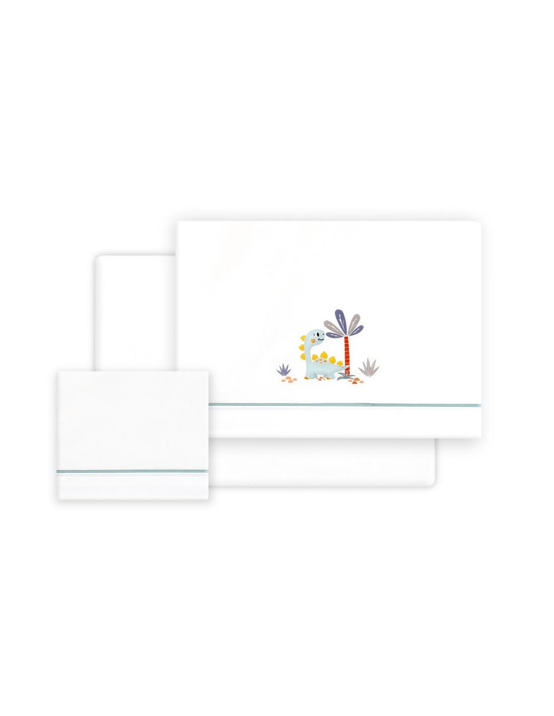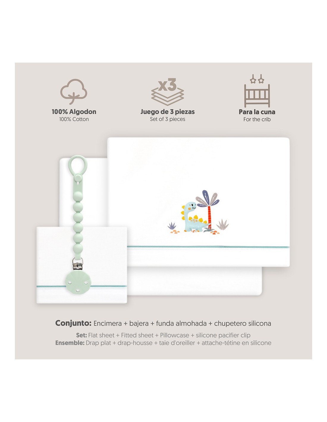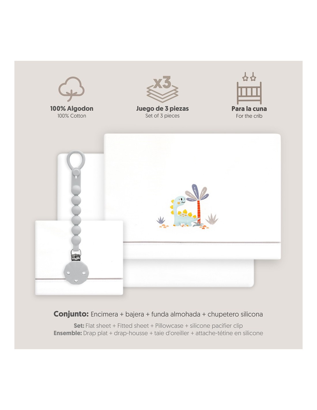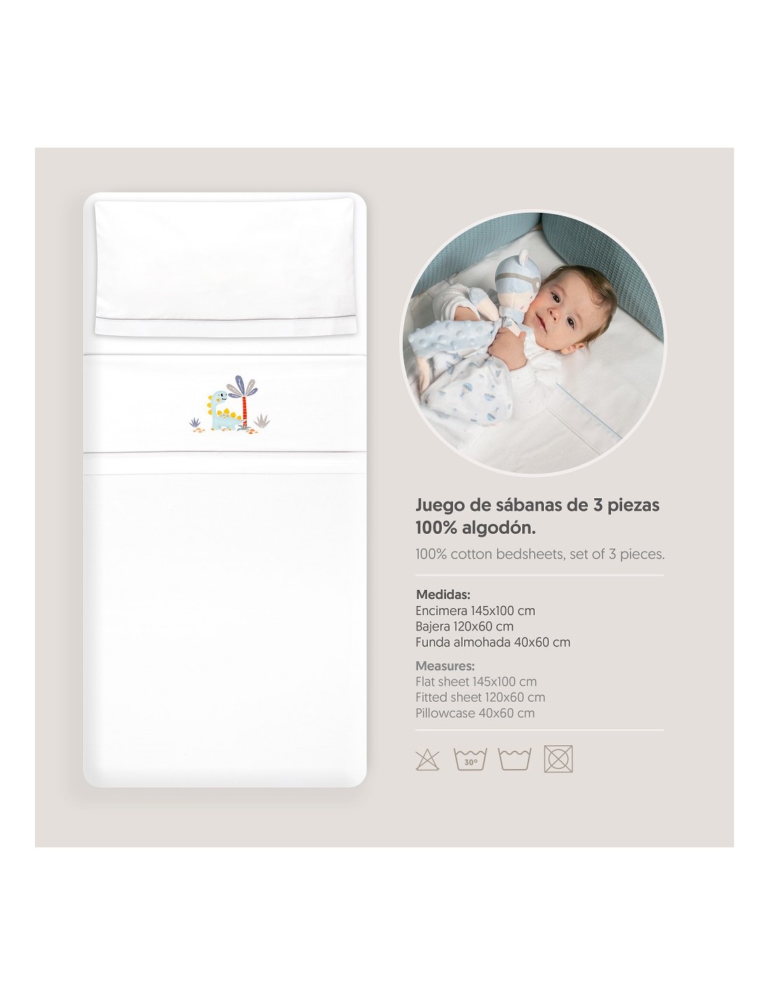 Juego de sábanas de algodón para cuna de bebé compuesto por: sábana bajera, sábana encimera y funda de almohada.