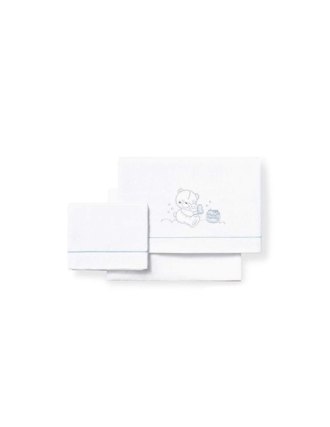 Juego de sábanas de algodón para cuna de bebé compuesto por: sábana bajera, sábana encimera y funda de almohada.