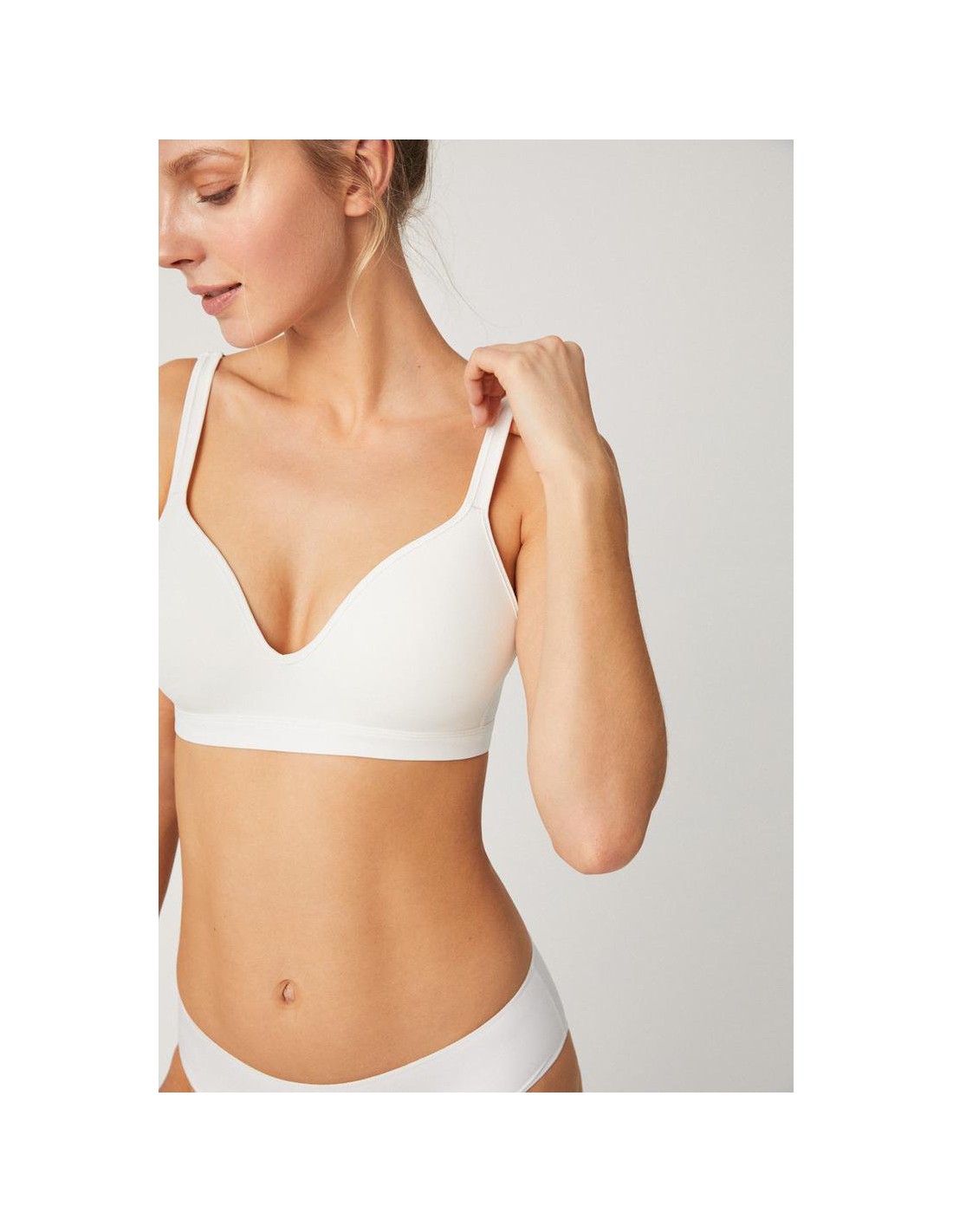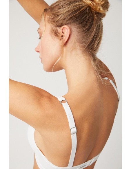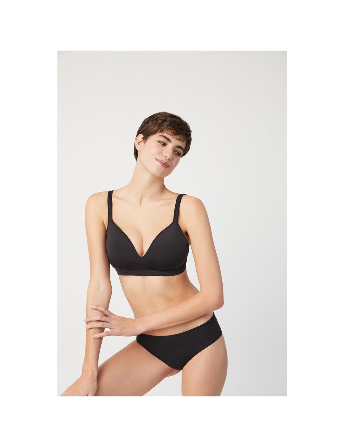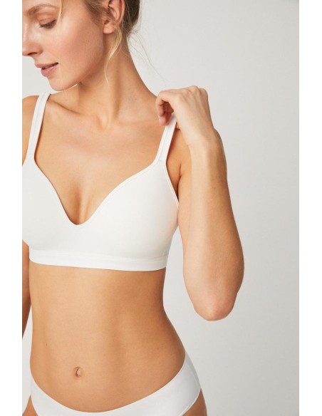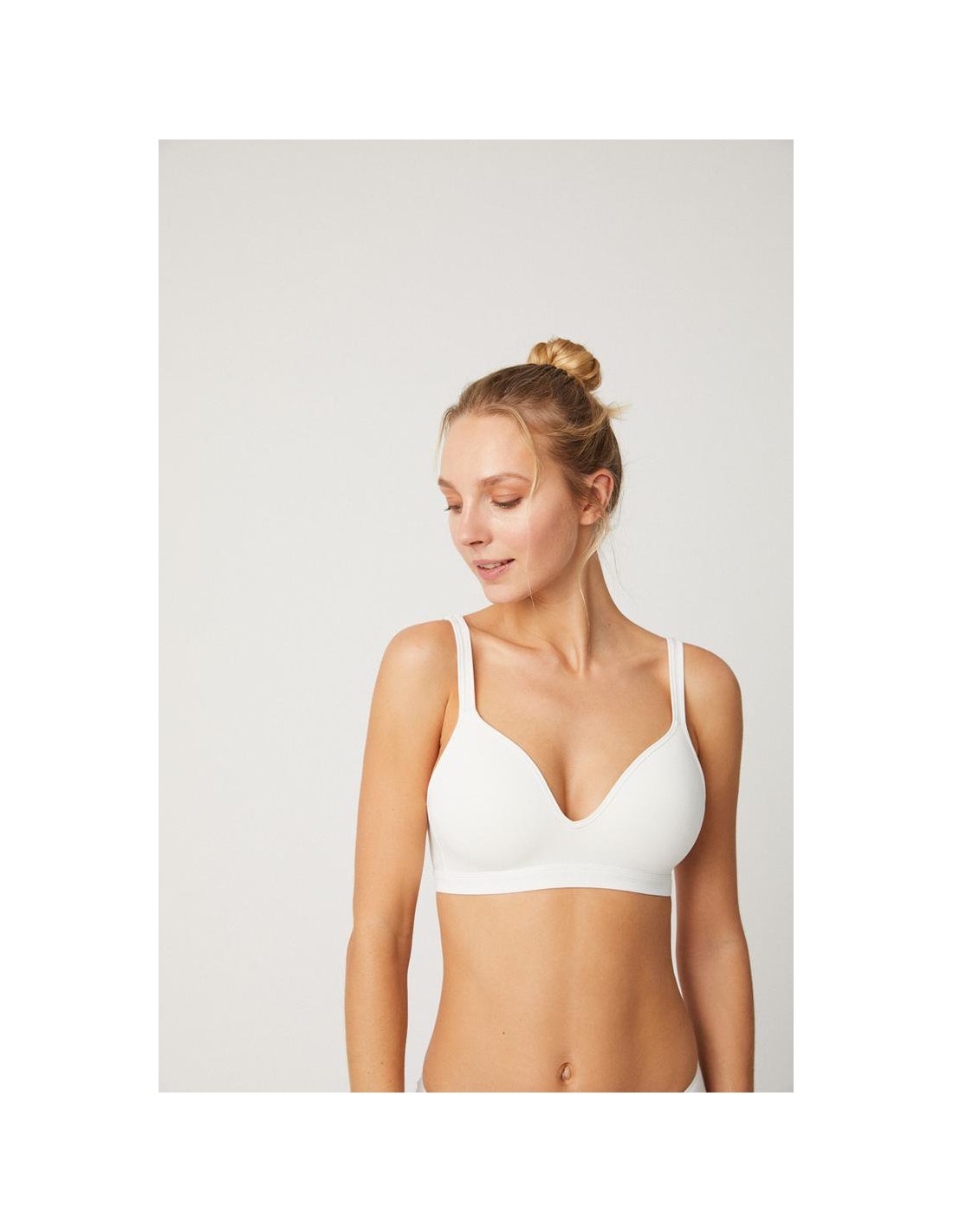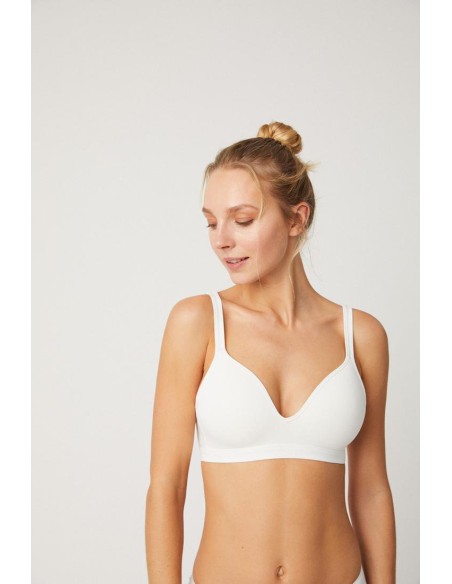 Nueva Colección Essentials. Sujetador con cierre ancho e interior forrado en microfibra llegando hasta 4 posiciones para una mayor sujeción. Sus copas continuas sin aro presentan extra confort. Los tirantes reforzados con reguladores metálicos aportan máxima sujeción y control.